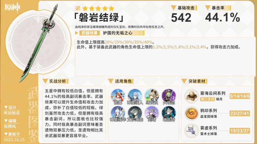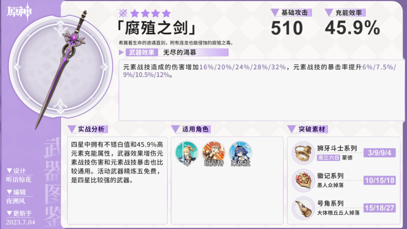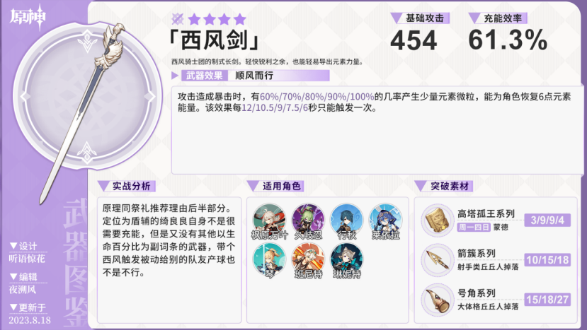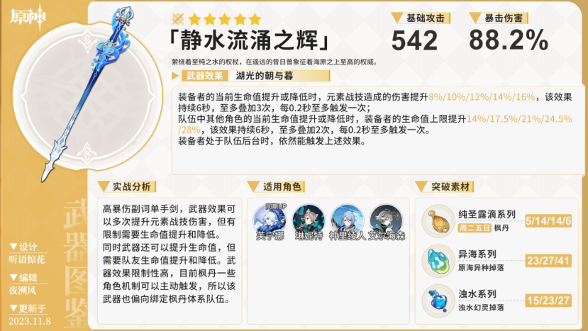 解析:便宜好用的四星武器,芙芙可以频繁触发特效,为自己和队友充能。适合主要为队友提供全程增伤覆盖的芙芙。