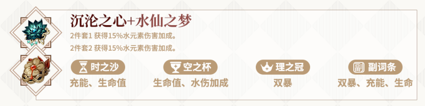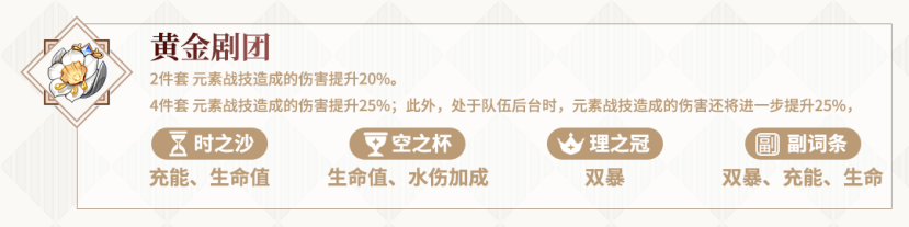 芙宁娜的圣遗物套装当然优先推荐黄金剧团,此外二水/二剧团/二生命的搭配可以用于过渡。