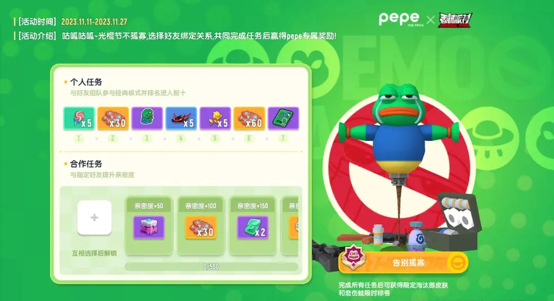 肠肠还可以与指定肠友互相选择,一起解锁悲伤蛙的合作任务!只要提升指定好友的亲密度,就可以获得悲伤蛙送出的奖励!与肠友累计提升亲密度后,肠肠可以获得对应的活动奖励包括限时称号和联动淘汰郎等奖励~需要肠肠们注意的是只有在活动期间提升的亲密度才能被记录在本次活动中~
