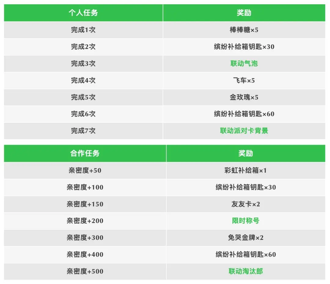 本次活动中肠肠们共可获得联动气泡表情、联动派对卡背景、限时称号、联动淘汰郎、棒棒糖×5、飞车×5、金玫瑰×5、友友卡×2、免哭金牌×2、彩虹补给箱×1、缤纷补给箱钥匙×180