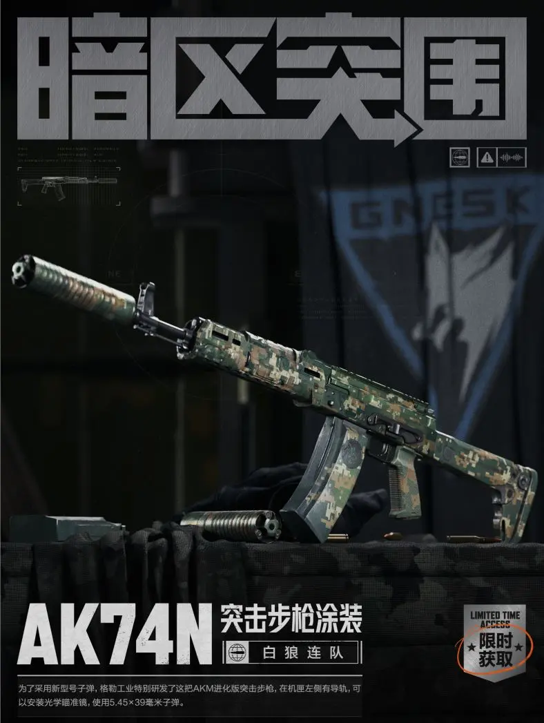 白狼连队·AK74N枪械涂装使用了白狼连队一贯的森林迷彩外观,以绿、黄、白三色为主体,可以完美的与草丛融为一体。