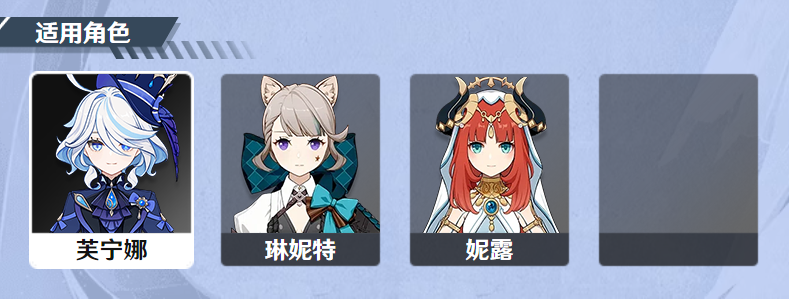 「琳妮特」:作为枫丹角色能在施放战技后稳定触发武器特效,虽然能够利用元素战技增伤效果,但生命值提升效果还是浪费了。