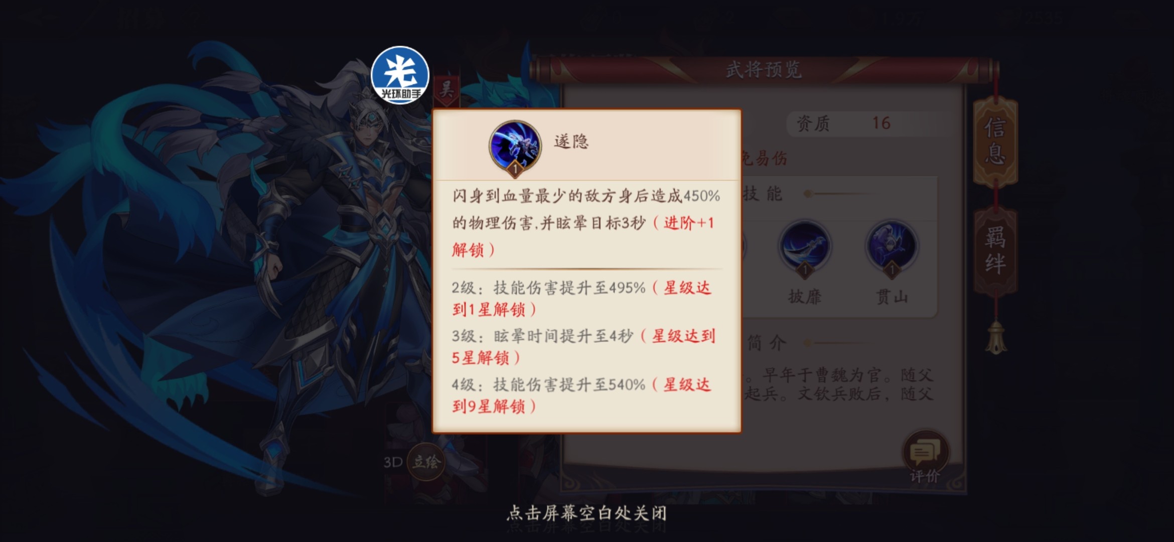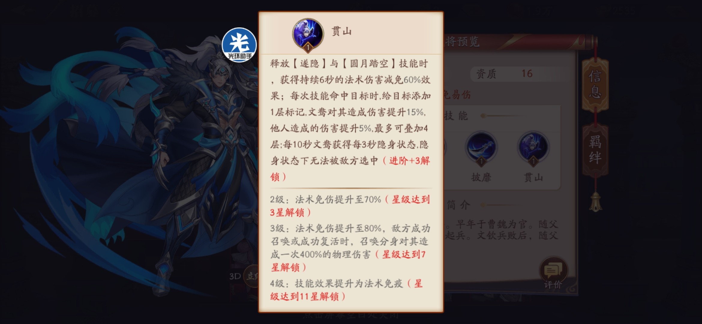 总结从功能上来讲文鸳还是很不错的,虽然没有吸血和物伤减免,但是他有隐身,有高额法伤减免,虽然伤害系数不是很高,但是怒气技能、一技能和高星二技能都具备打断能力,而16资质的面板和成长还是不错的,所以整体来说文鸳是一个很不错的刺客,功能比较全面,但是单体伤害主要只能依靠一技能,想对单体持续造成伤害达成击杀还是需要一定的环境基础的。
