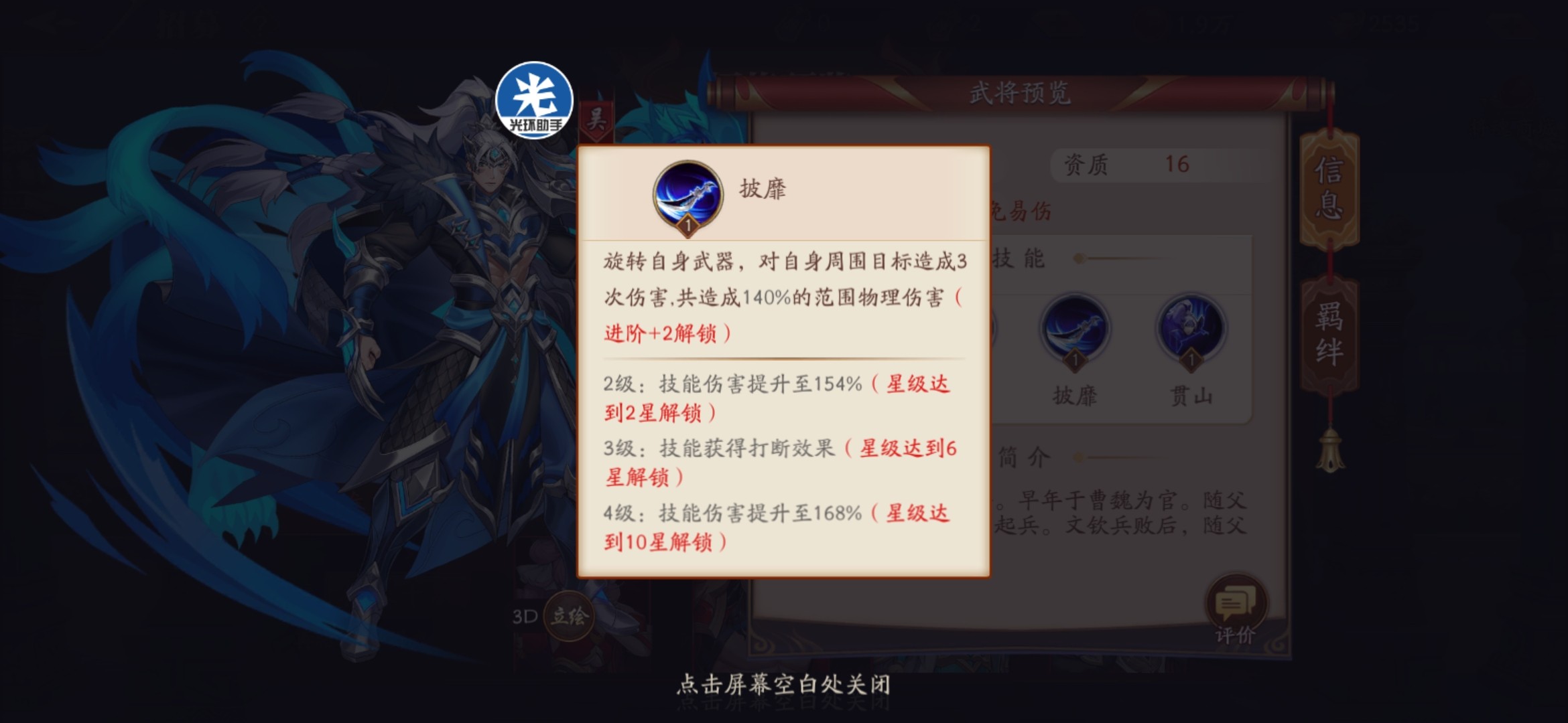 对范围内所有目标造成物理伤害,文鸳升到6星该技能会具有打断敌方施法的效果,一个范围打断还是很不错的,而配合一技能突进后进行的范围打击是人堆里释放的,非常的划算,同时又能范围附加标记,更有利于文鸳输出。