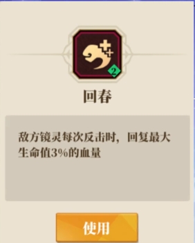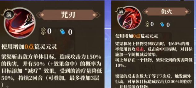 玩家使用后,当梁果和场上的其他单位受到攻击时,有【60%】的概率使用普攻进行反击。反击命中目标时,会对目标施加一个随机减益效果。每有一个怪物在场,梁果受到的伤害就会降低10%。当梁果的反击次数达到7次或以上时,会触发额外行动,对单体目标造成攻击力 200%的伤害。