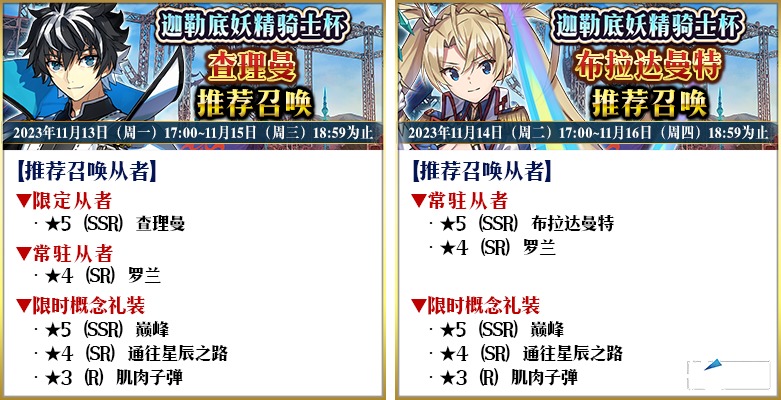 限时活动「迦勒底妖精骑士杯~第二代的凯旋~」的相关从者中,推荐召唤包含限定从者「★5(SSR)查理曼」的3骑从者的2种卡池开放!