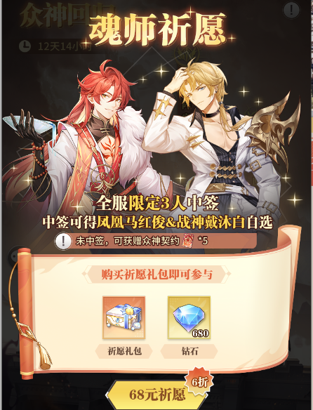 1.活动期间,心愿魂师「战神戴沐白」、「凤凰马红俊」获取概率大幅提升,且心愿魂师只可通过选定抽取。维序者可选择使用「众神契约」或钻石召唤心愿魂师!