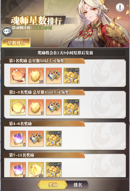 活动期间,根据魂师培养星数、试炼之境排行以及战力进行排行,!可获得专属头像框「魂师领导者·冠」、「魂师领导者·亚」、史诗四系自选卡等超值排行奖励,努力拿下榜首吧