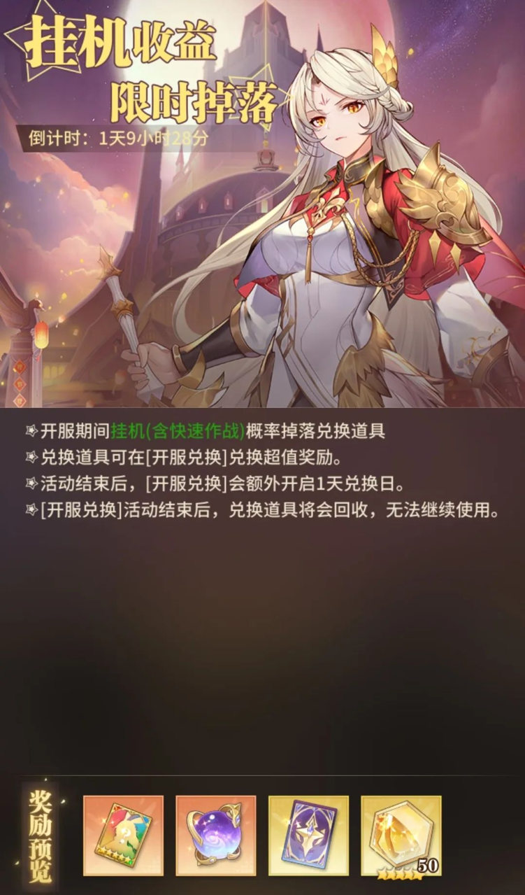 活动期间,挂机(含快速作战)概率掉落兑换道具——众神水晶,可用于兑换【开服兑换】中的超值奖励。