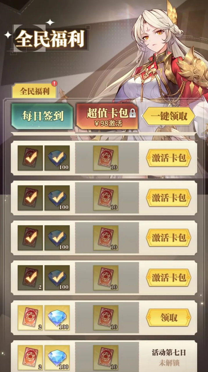 活动期间,每日签到即可领取众神契约、钻石等奖励~