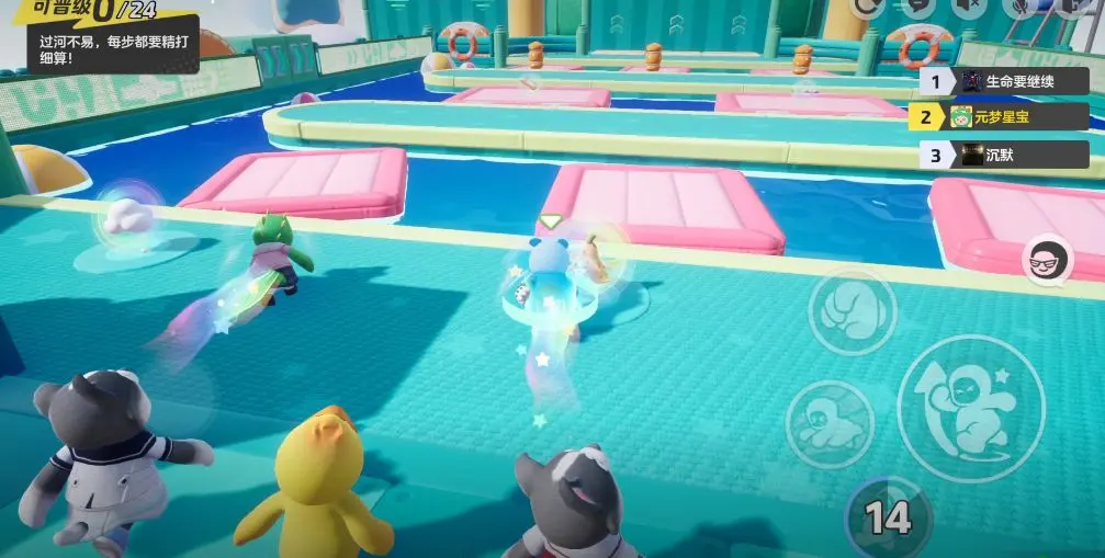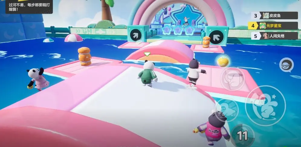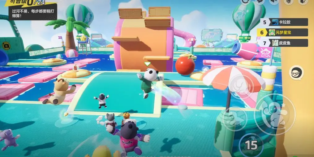 在水上嘉年华这张地图中,我们需要通过障碍,度过河流,稍有不慎,就会落入水中。比赛开始后,我们将率先面对水上的浮板,只需掌握好跳跃距离即可轻松通过。