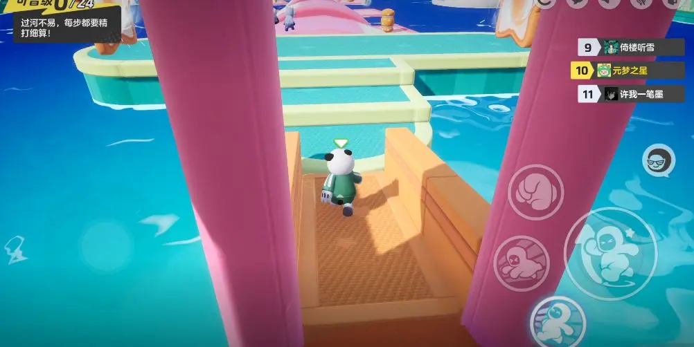进阶技巧二:想度过这片水域,除了中间的水车以外,两边的浮板也是一种选择,难度不大。但是,两边会受到火炮等机关的干扰,且到达岸边后找到滑梯还需要更多时间。因此,建议大家能走水车最好,如果中间太过拥挤,再走边路。