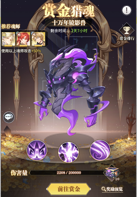 活动期间,挑战赏金魂兽,有机会获得大量金魂币和【赏金赠礼】(可随机开出一定数量的灵魂契约、魂骨强化石、进阶石),结算时根据历史最高伤害排名,可获得原初之灵、高级魂骨强化石、祈祷币等超值排名奖励!