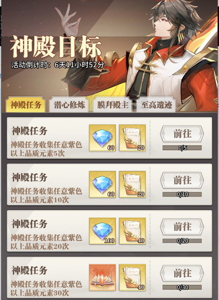 活动期间,维序者成神即可参与活动,完成神殿任务就能领取丰厚的奖励道具:启封秘籍、秘籍残卷、钻石等。