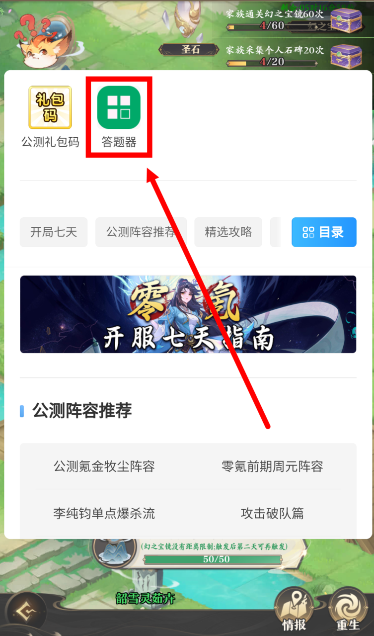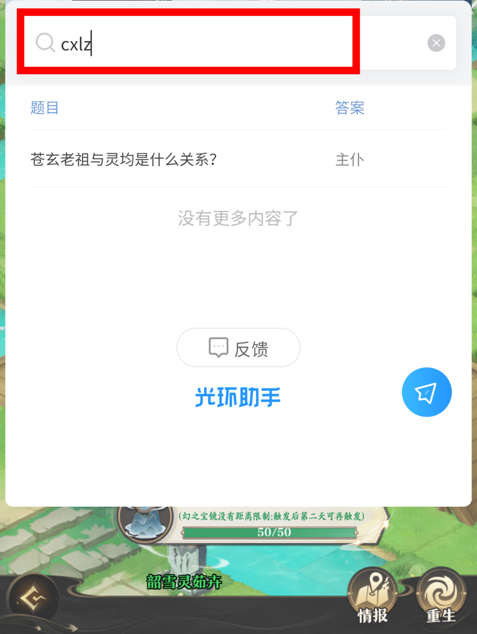 家族探索-幻之宝镜光环答题器上线!!光环-小井发布于 2023-11-16关注家族探索的幻之宝镜中,是否经常遇到原著相关谜题,让没看过小说的路人抓耳挠腮? 光环助手特地收录了所有题目,在游戏中遇到难题直接就能打开查询,保证你一路畅通拿到最高奖!1、游戏中打开悬浮窗 2、点击“攻略专区”按钮 3、点击“答题器”进入 4、只需在搜索框中录入拼音首字母就可快速获得题目答案啦!