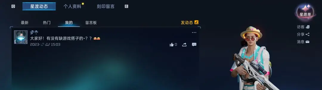 3、打开星渡空间(从微端进入),在星渡动态与其他幸存者互动,分享游戏内外趣事;4、打开玩家社区(从微端进入),在社区圈子参与话题讨论,交流各类游戏攻略。
