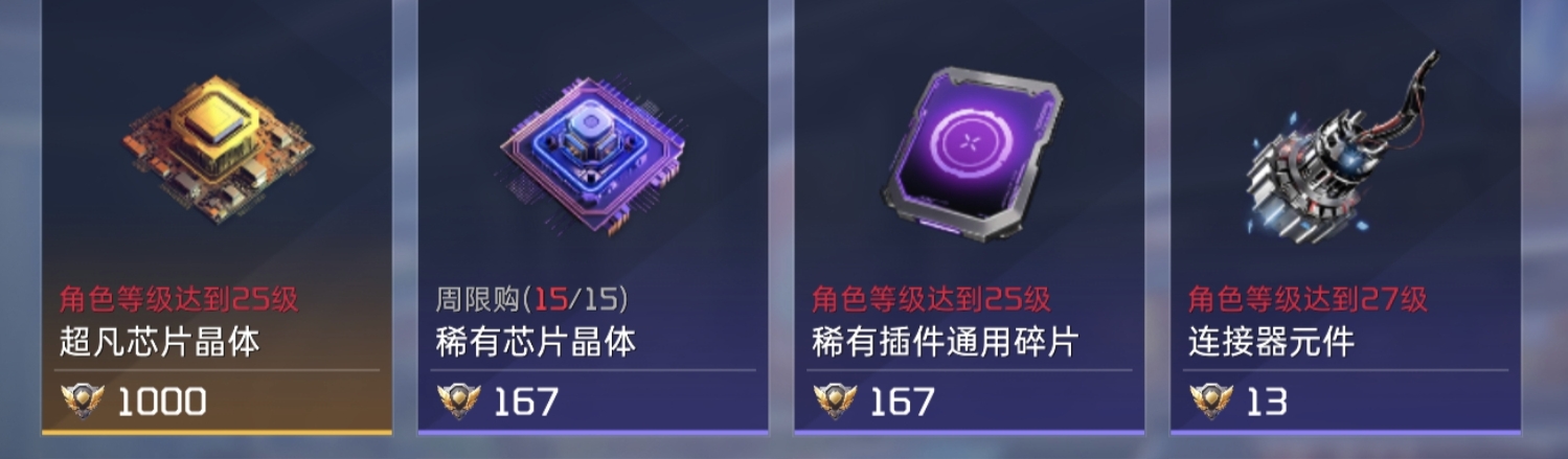 ②25级以后每周兑换【超凡芯片】和【稀有插件通用碎片】【连接器元件】。