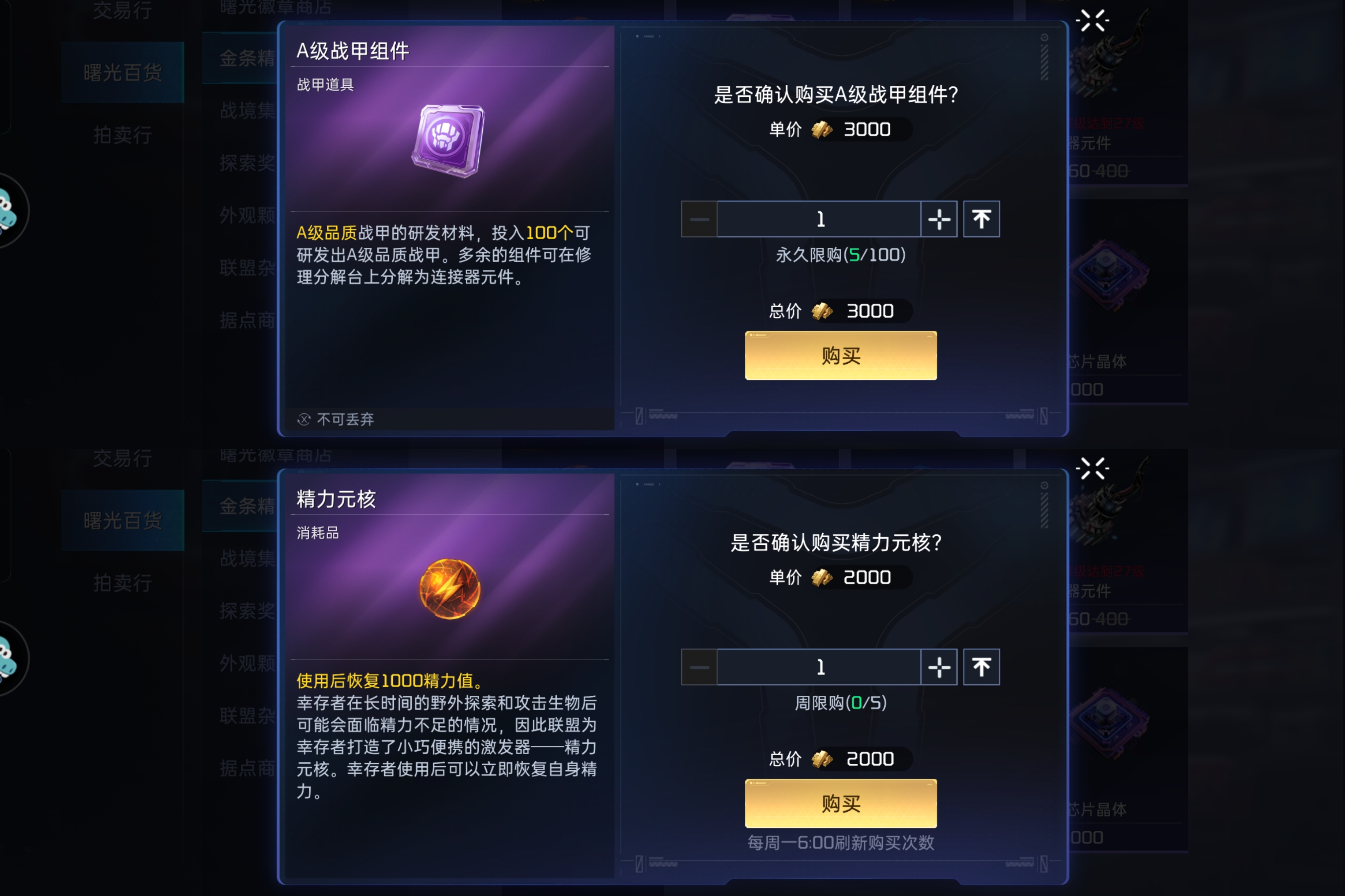 这个商店狮子兑换优先去兑换【A级战甲组件】,优先把A级战甲做出来,提升战斗能力,才是核心。