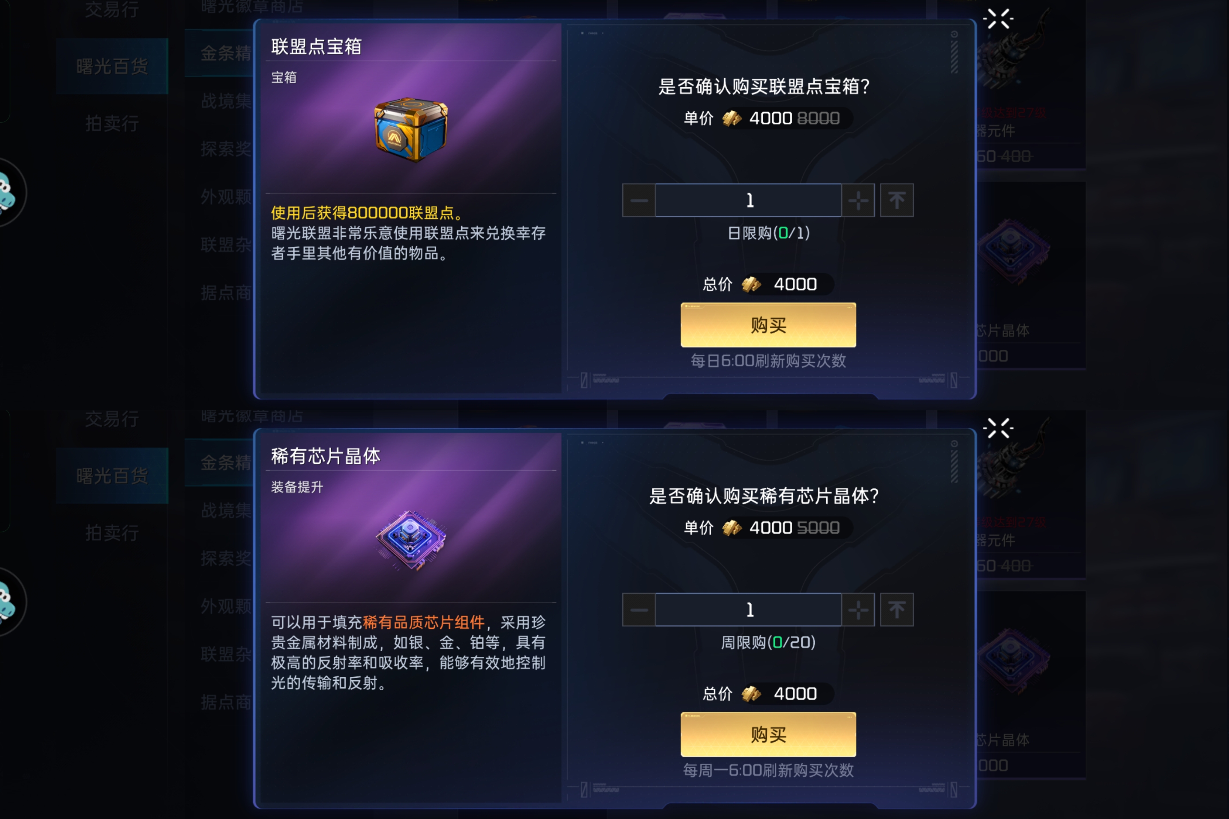 比较不推荐大家去兑换【联盟点宝箱】和【稀有芯片】性价比太低了,非常不划算。