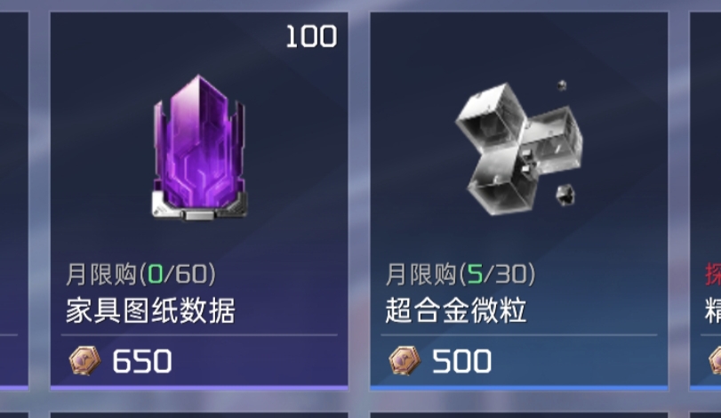 像【家具图纸数据】【超合金微粒】每个月都尽量兑换满。因为这2个资源是我们的庄园初步的建设和改造装备的核心道具。