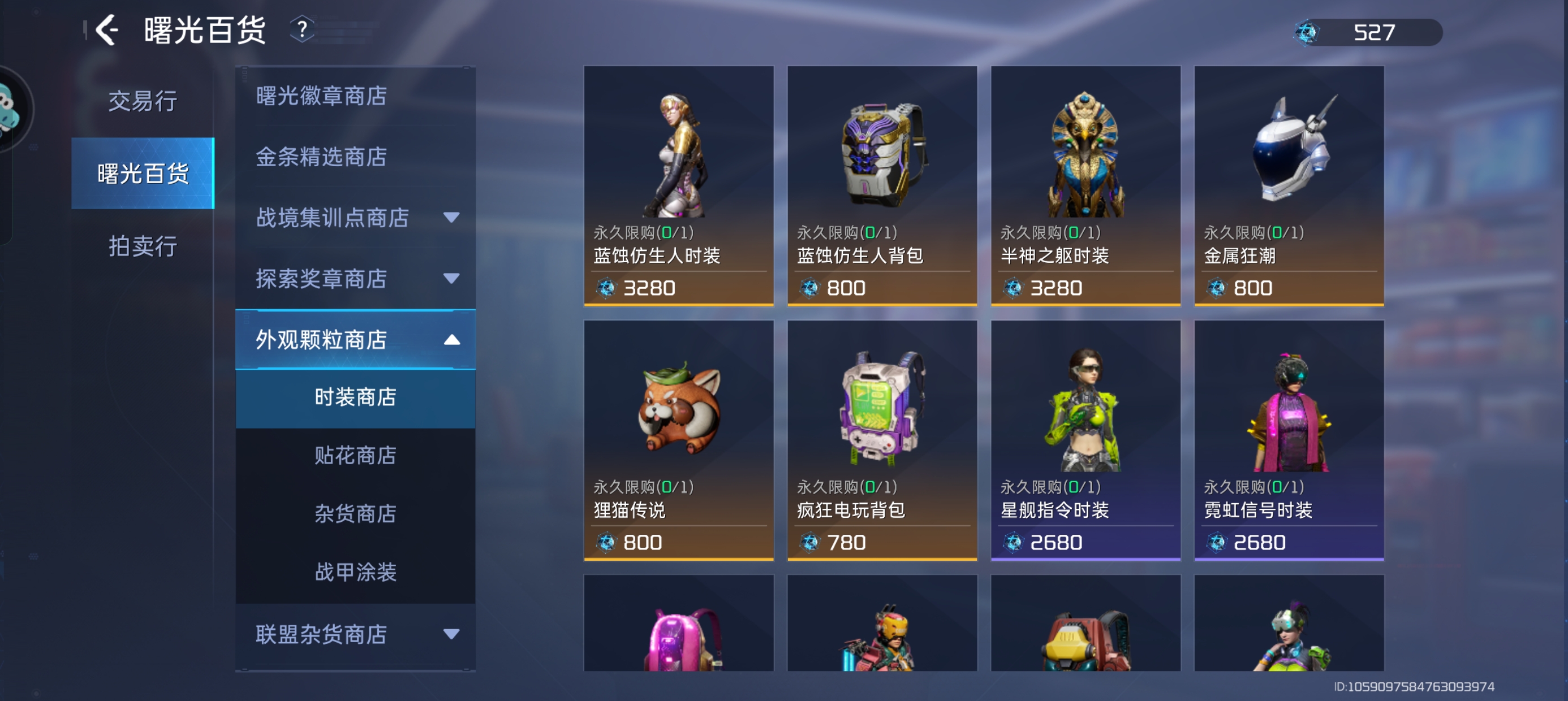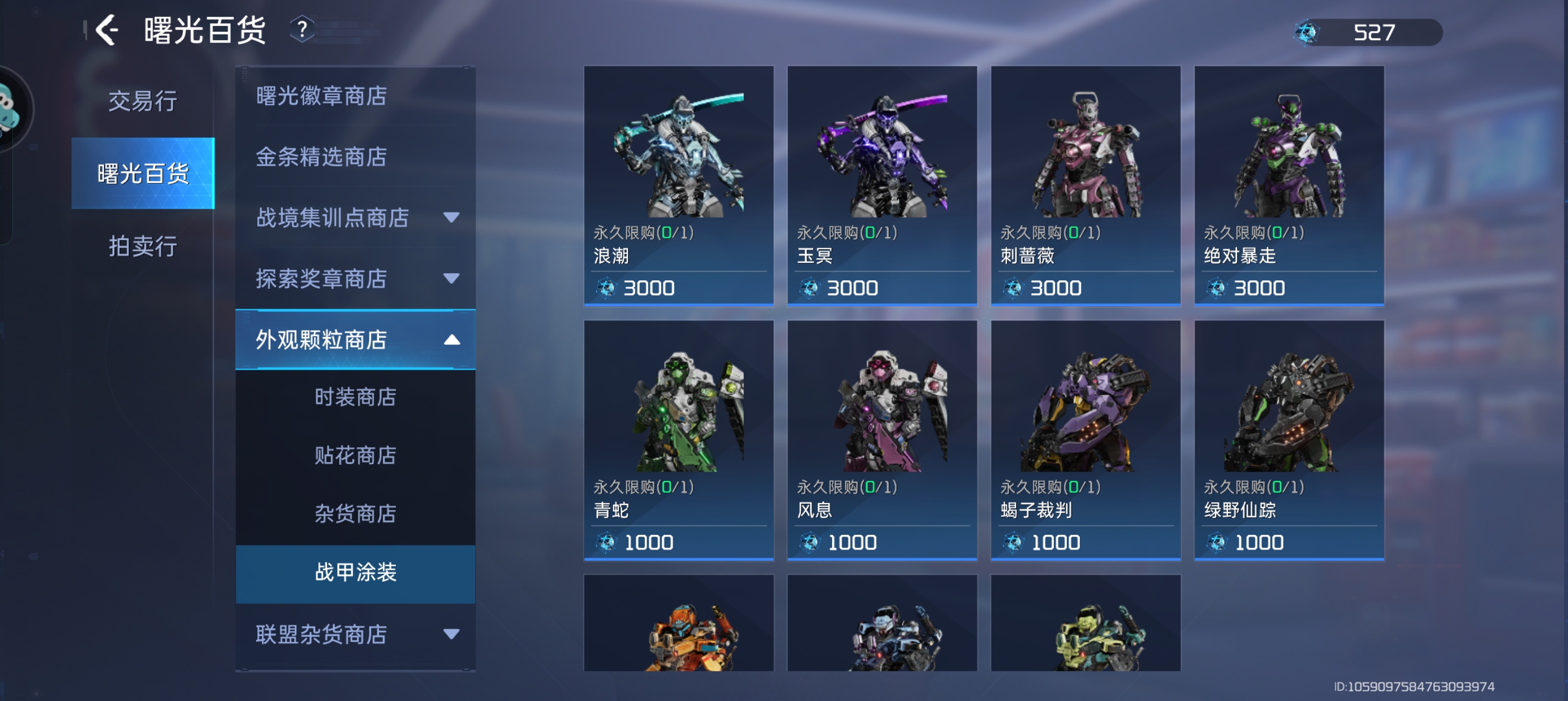 一共分为四大系列商店:时装商店、贴花商店、杂货商店、战甲涂装。