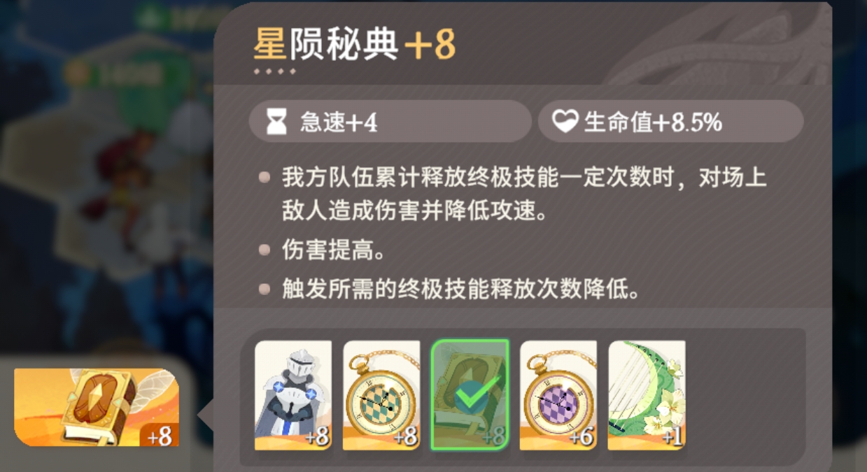 星陨秘典8级:这是一本神秘的法术书籍,当你使用星陨术时,额外急速 +4:提升你的攻击速度,使你的攻击速度额外提高 4。