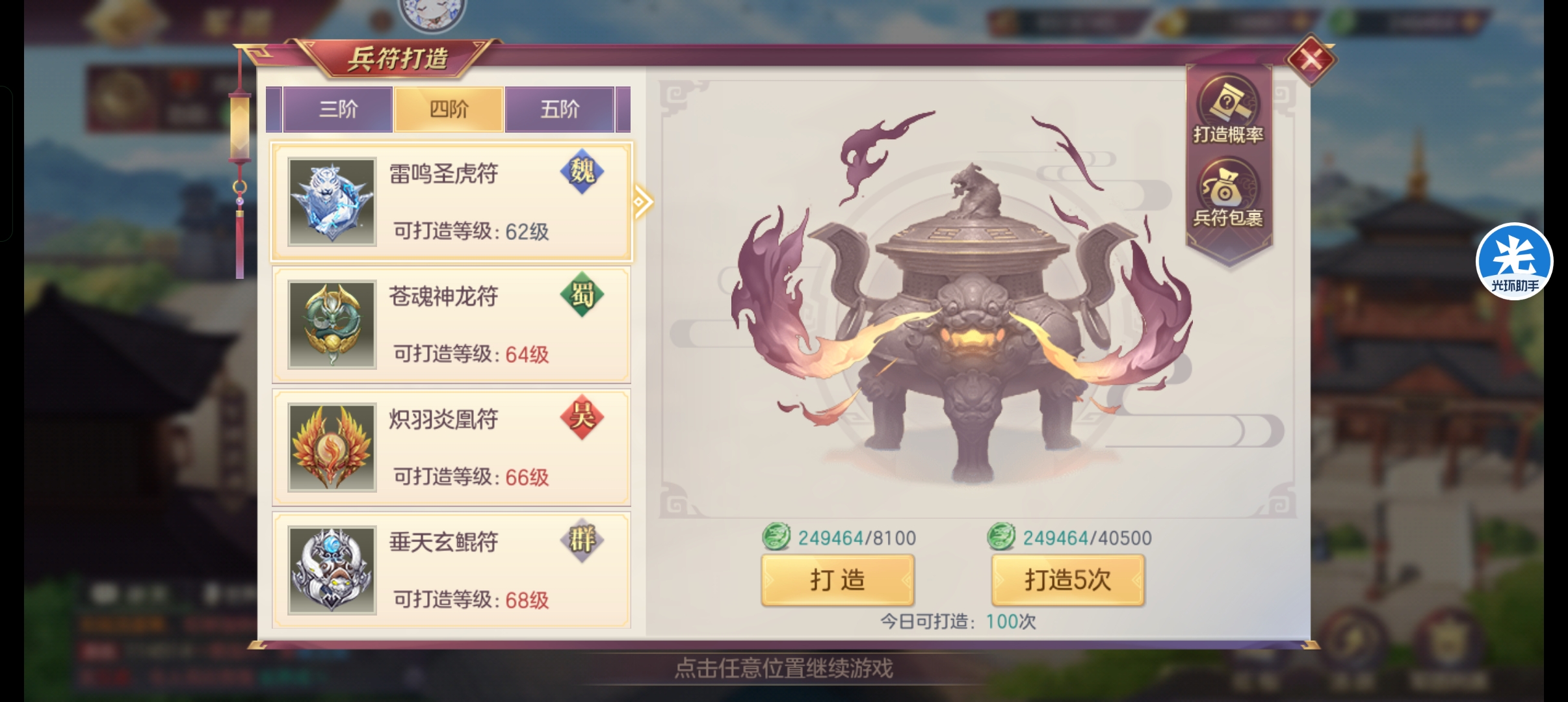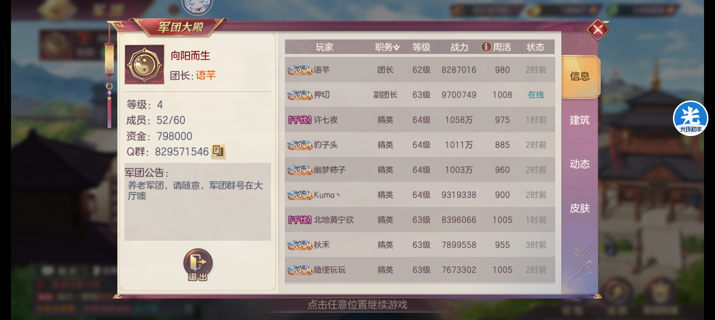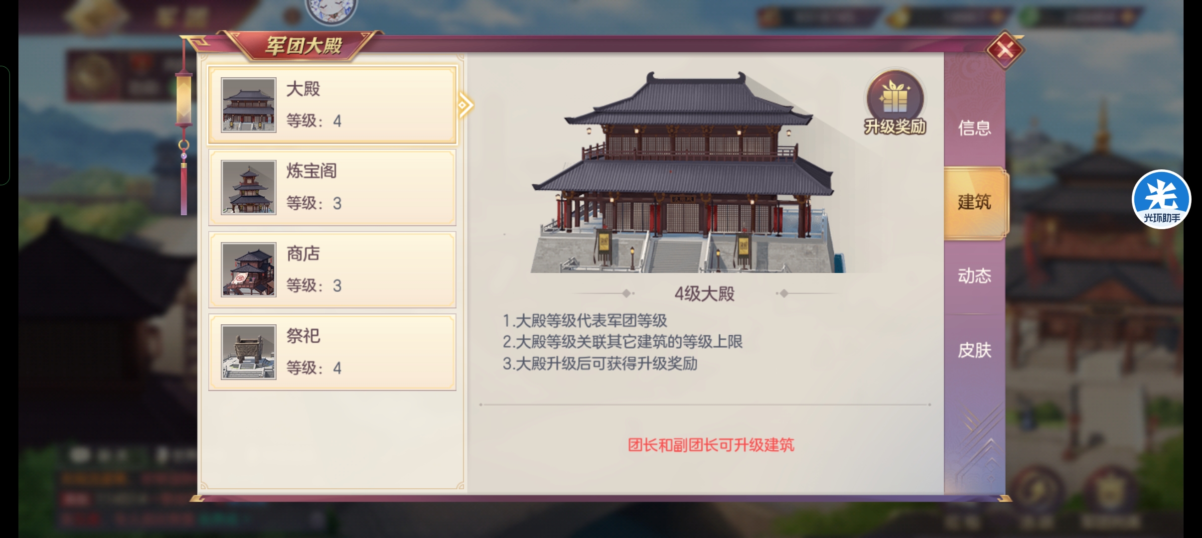 大殿中团长和副团长可以进行建筑升级,升级后可以提升活动的奖励、打造兵符*、商店增加格子等等