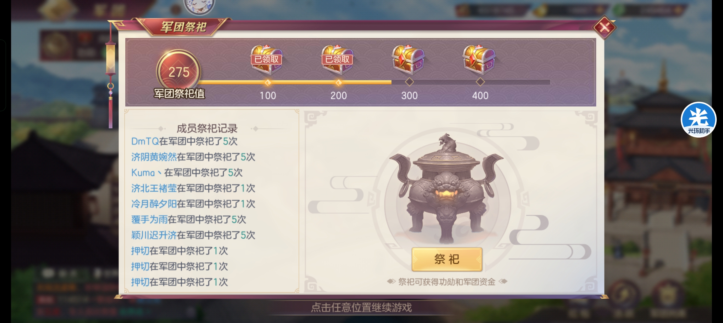 是稳定获得功勋和军团资金的来源,每天可以免费祭祀五次,后续需要花费元宝