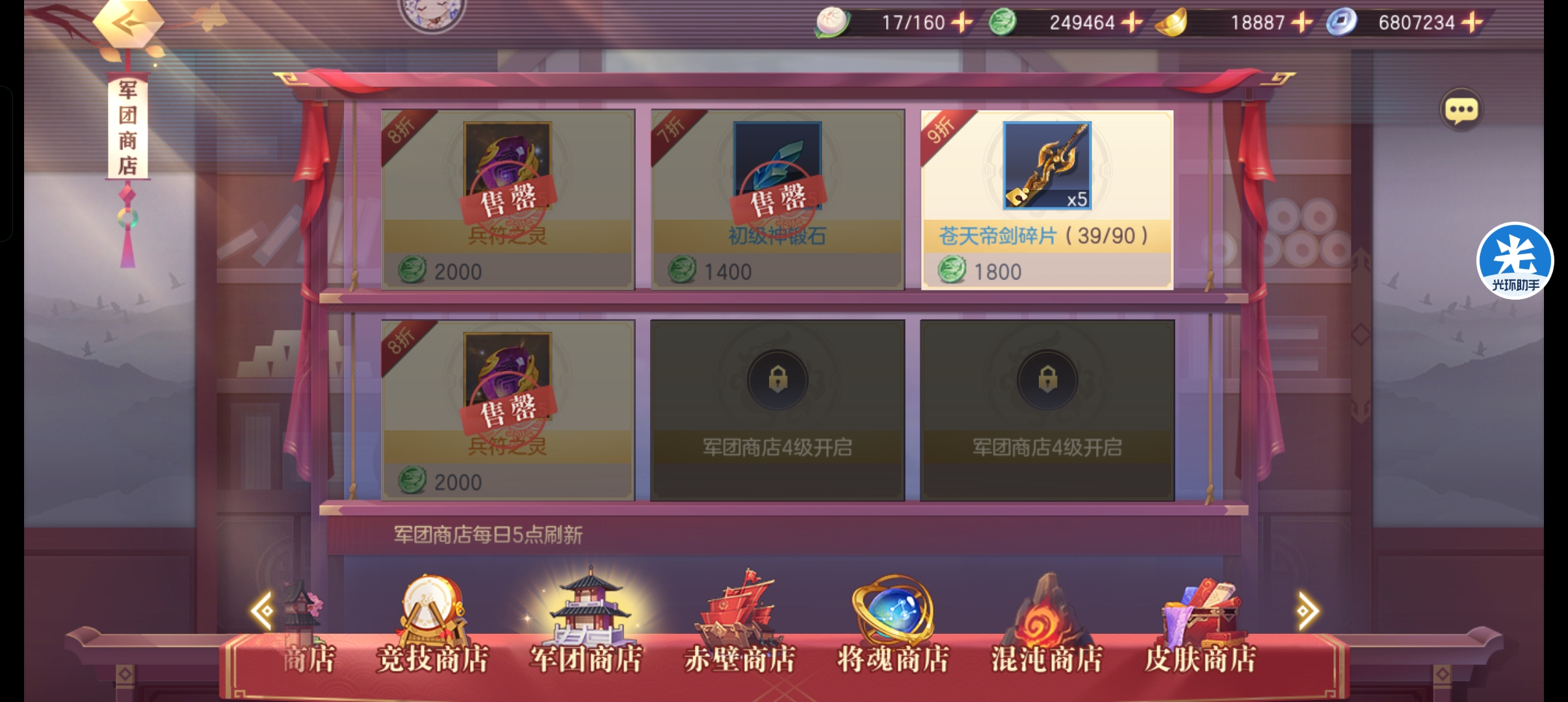 随机出售商品,有橙紫蓝神兵碎片、神锻石、兵符道具等等,随着商店等级的升级,出售道具也会变得高级