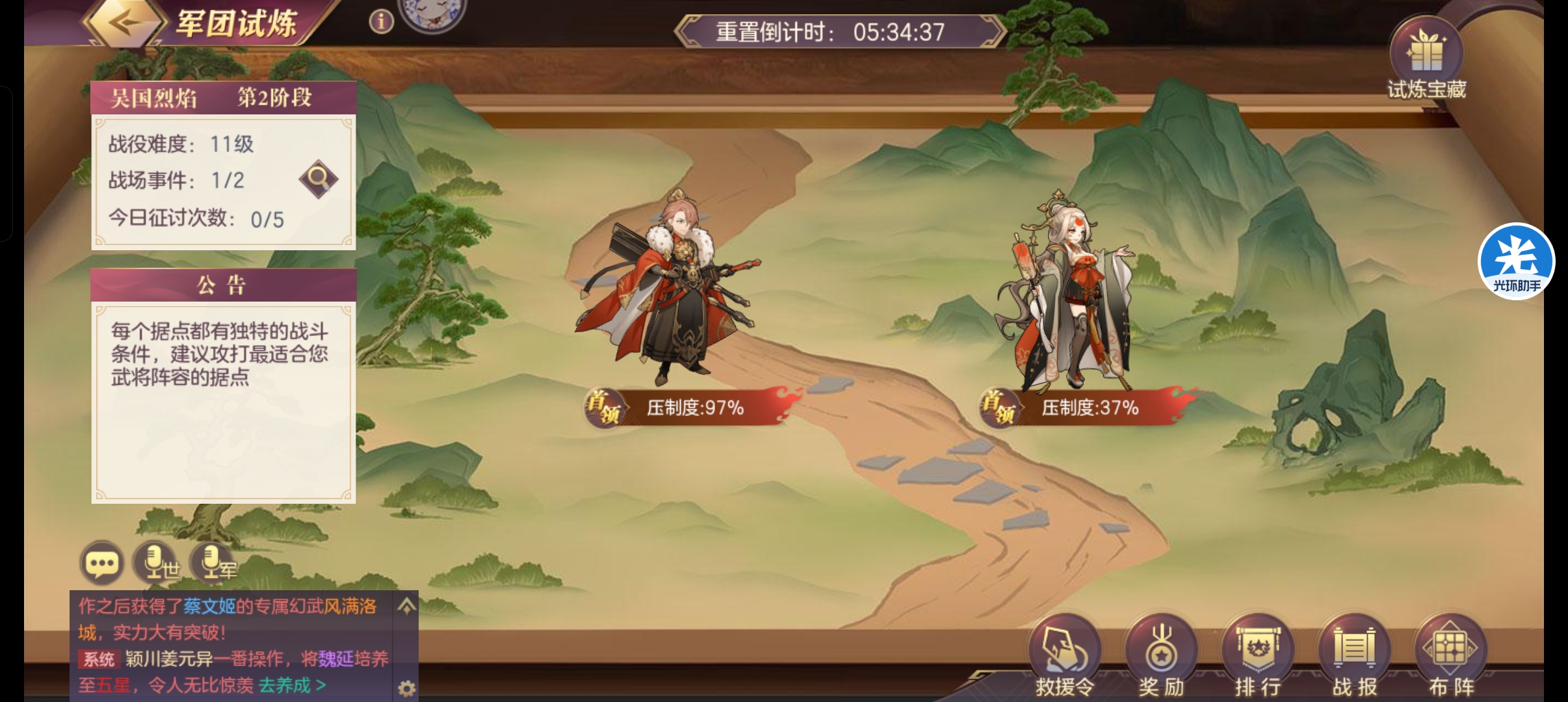 每日凌晨五点恢复五次挑战次数,晚上18点恢复至五次挑战次数(0次变5次,5次变5次),故有时间的小将军们尽量在18点前用完次数