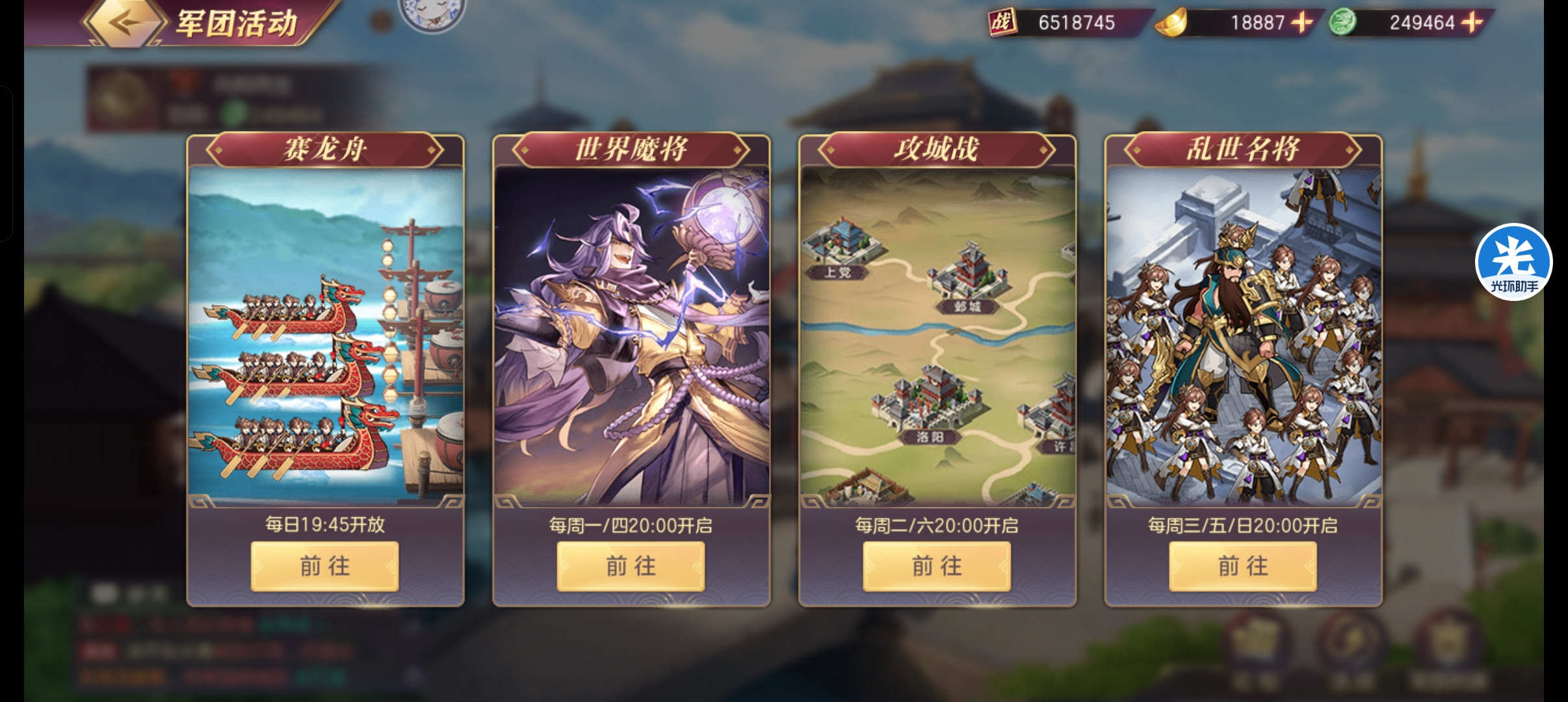 军团活动由两部分组成,一个是每日开放的赛龙舟活动,一个是每日开放其中一个的世界魔将/攻城战/乱世名将