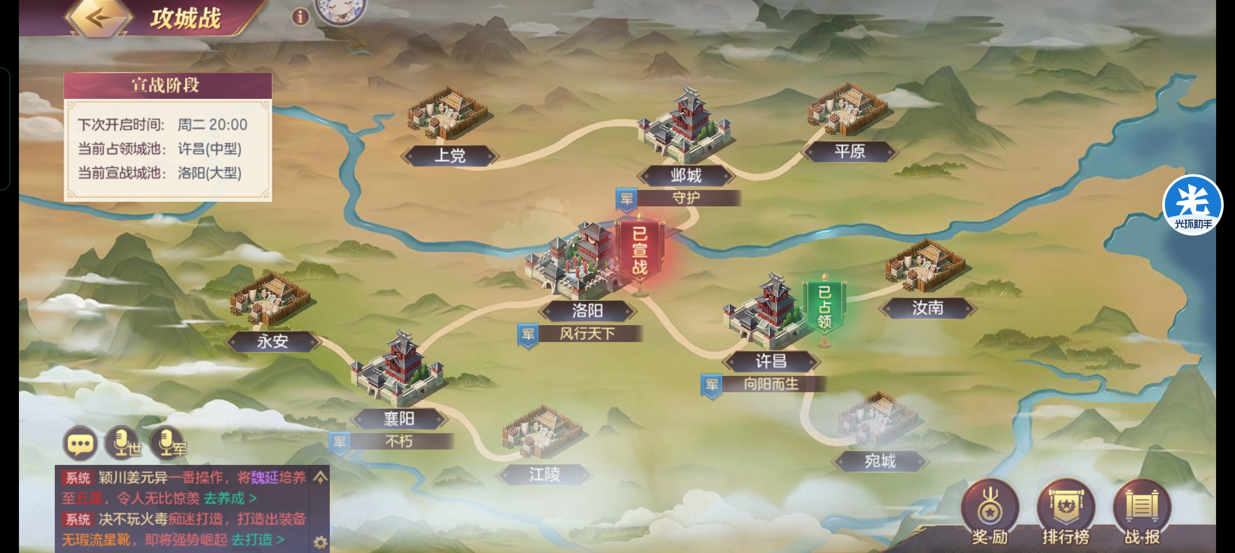 攻城战通过防守、攻打城门、攻打龙柱等方式决定城池的所有权,获得奖励及奖励加成