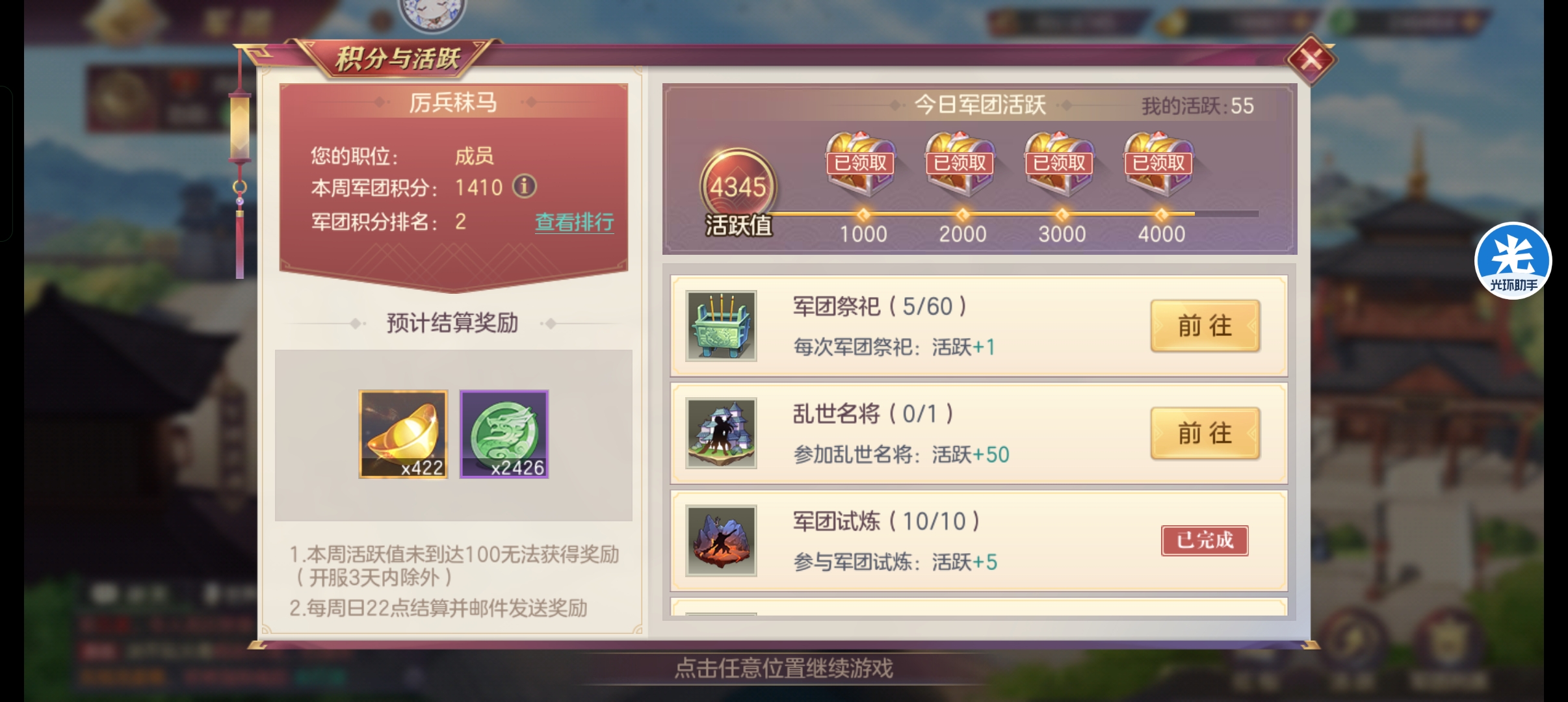 与其他军团的PVP战斗,可以获取大量资源,如争霸勋章、无双自选箱、神将神兵碎片等