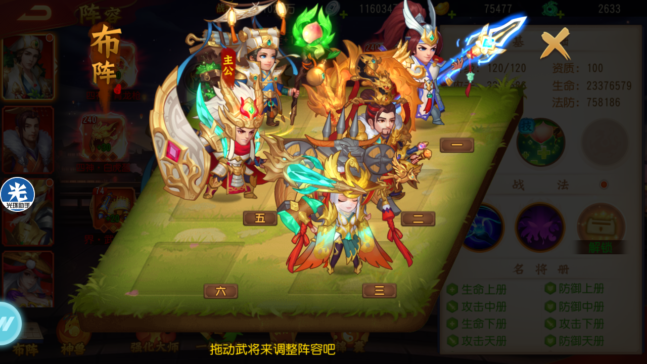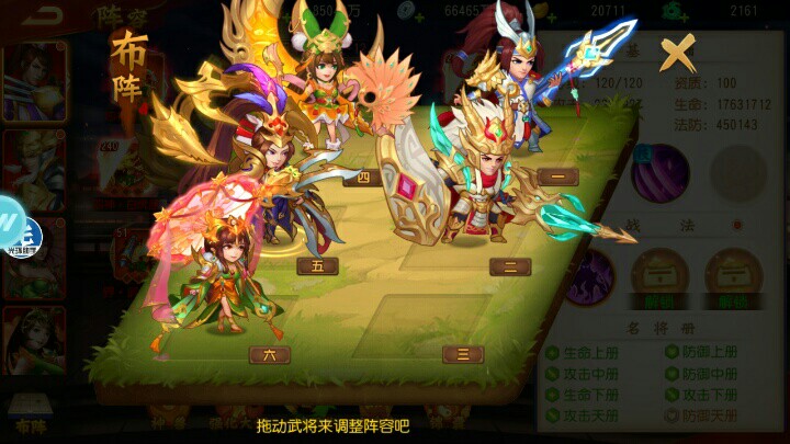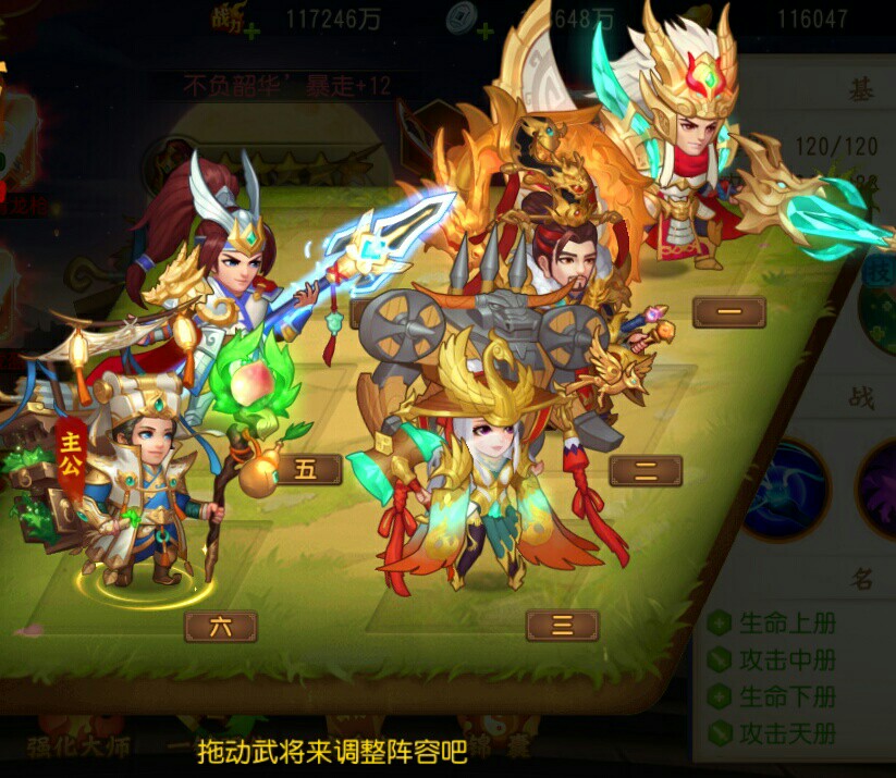 随着游戏的推进,不知不觉来到了120级,其间累积的资源可以说是非常丰富了。比如:武将、置换付。有了这些资源又可以轻松进行一波操作了,继续开战法,阵容再次调整。