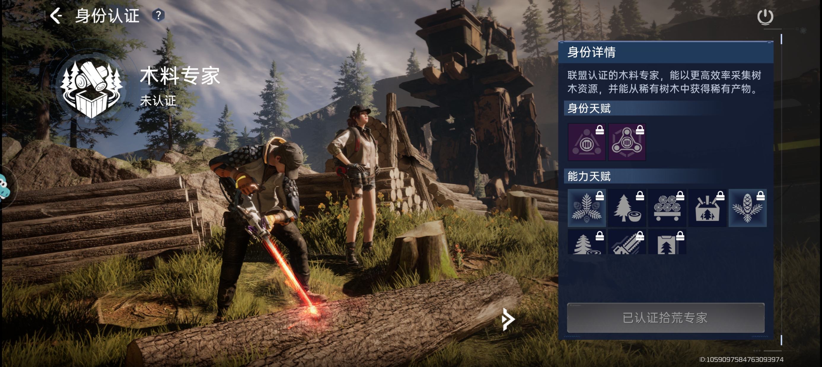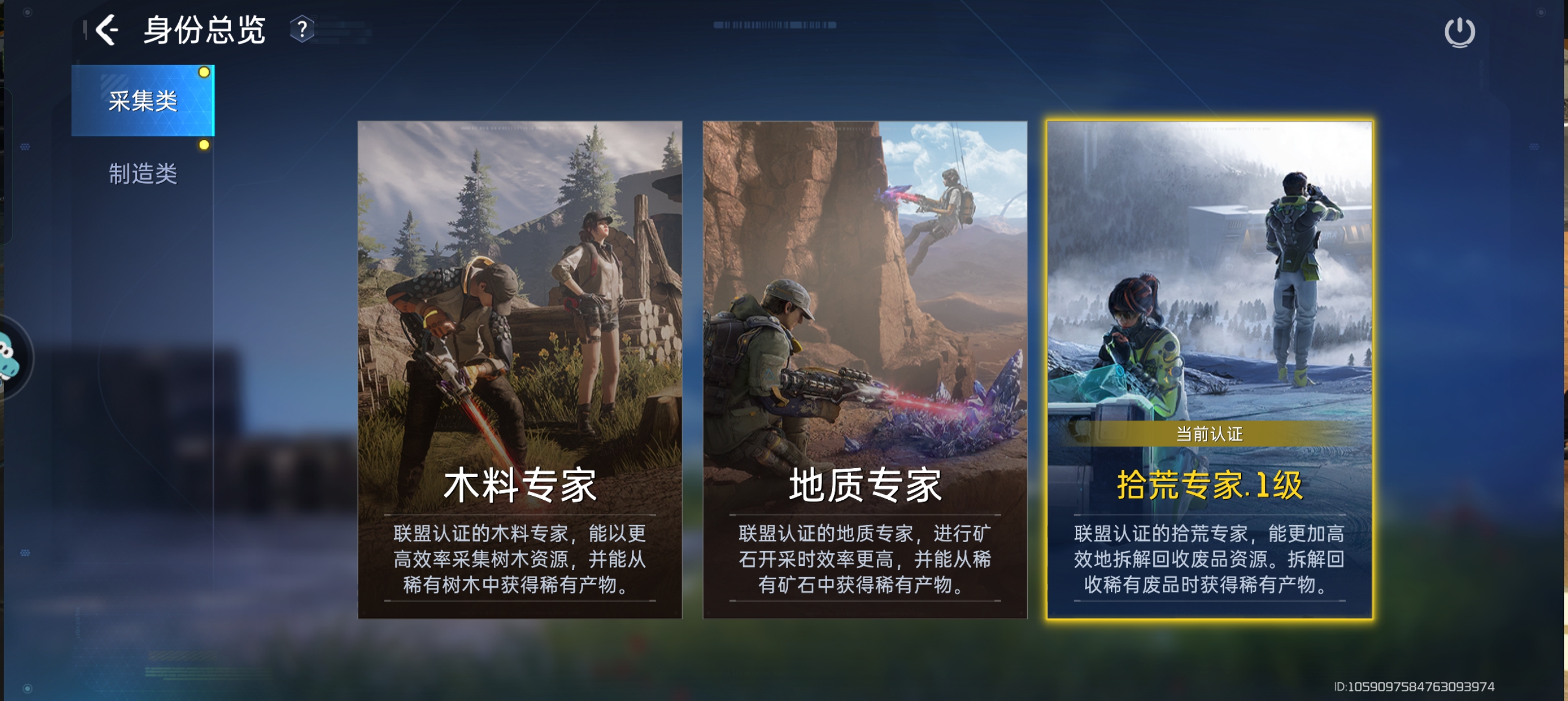 采集身份一共有3种类型分别是:木料专家、地质专家、拾荒专家。