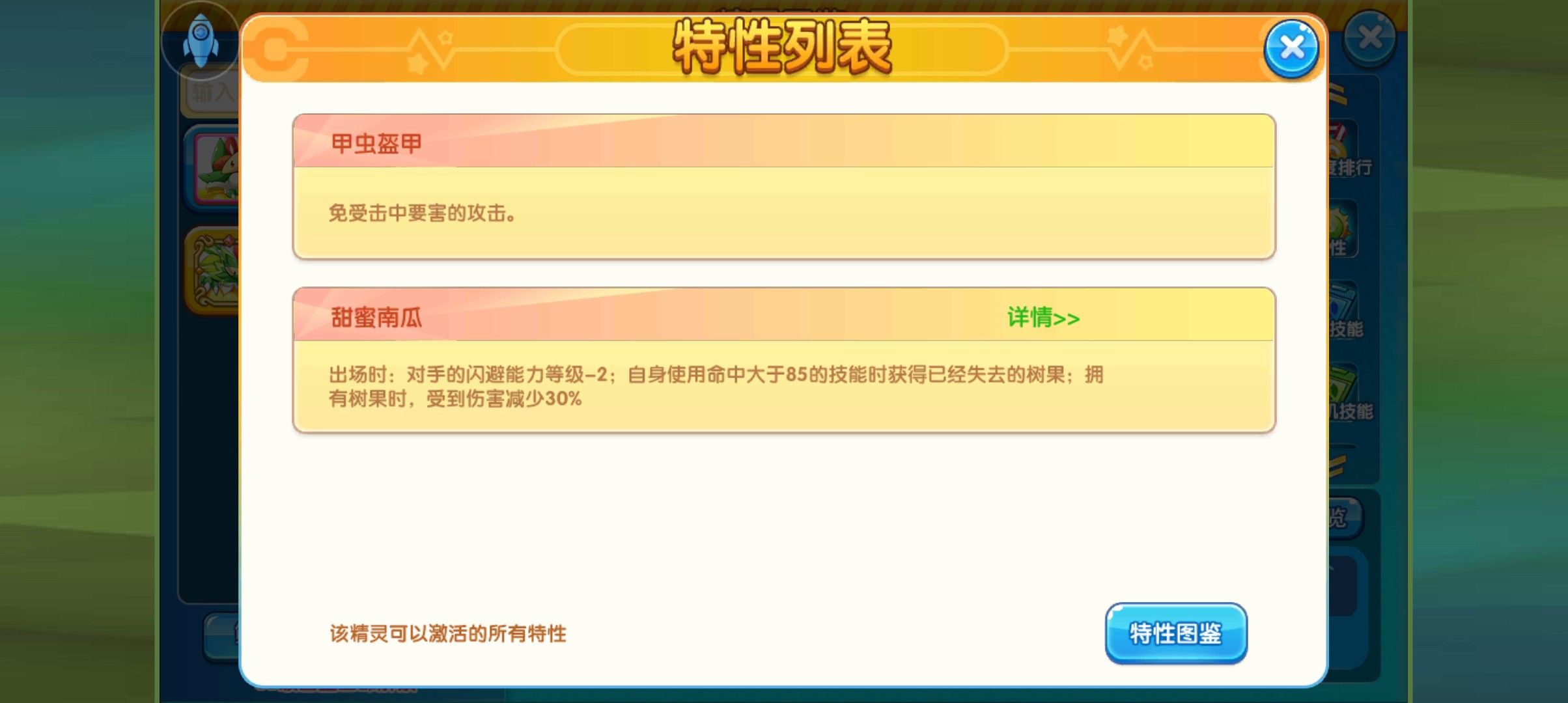 可以看到这个精灵的特性,出场时对方的回避会降低两级,也就是说自身的命中率会变相的提升两级,只要自身的技能命中率并不是太低,基本上都可以达到必定命中的效果。