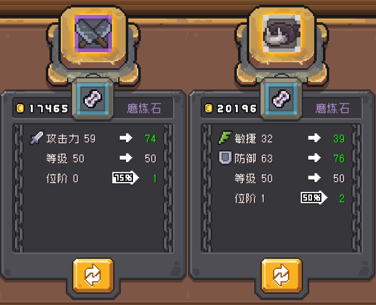 ④ 磨炼石:50级之前装备最多强化到+3,反正都是过渡品。打造和宝石50级之前更是碰都不要碰,因为打造和磨炼都是以你当前等级为准。如果装备等级低于人物等级,磨炼石会把装备等级提升至人物等级。如果装备和人物等级一样(我是50级后试的,50级之前不知道),则会有几率升阶。无阶到M为75%,M到G为50%。可以通过磨砺石,把一个双羁绊M装备变成G,省得再刷。