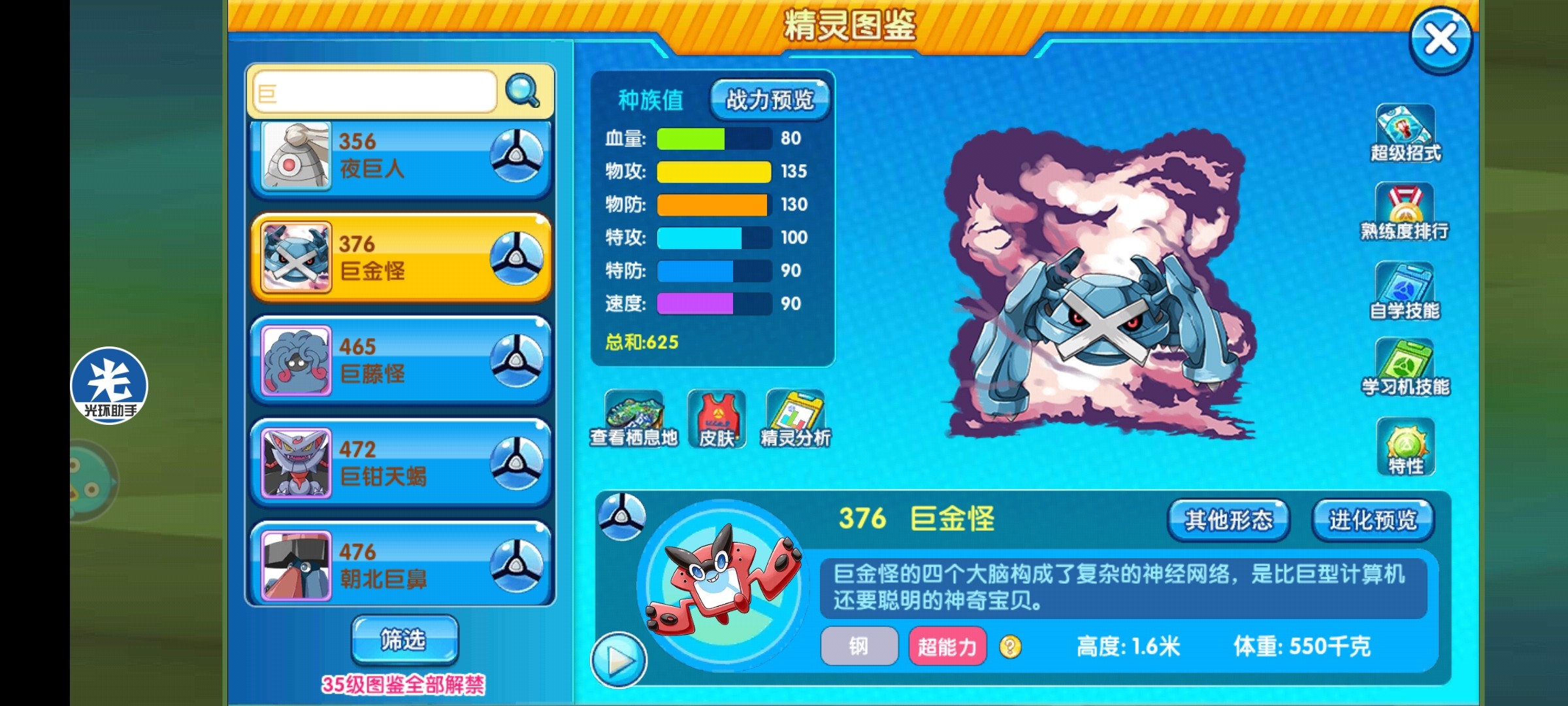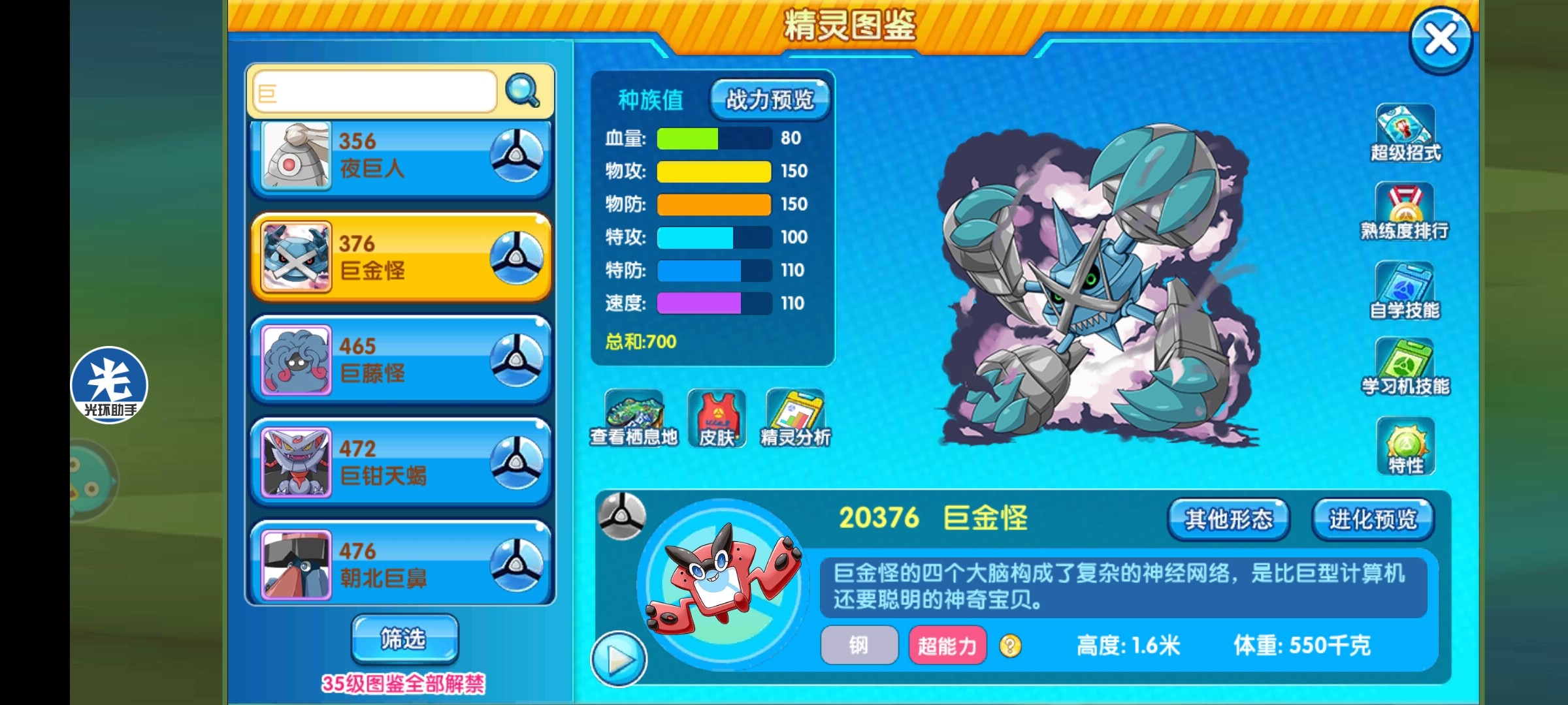 相比于其他地区,芳缘地区有两大准神,它就是其中之一,是和班吉拉一样,属于准神中“唯二”的精灵,巨金怪性格残忍,脾气暴躁,但战斗风格却十分沉稳,它会以超越计算机的判断力分析对手,冷静地将对手逼入绝境。同时,巨金怪领地意识很强,会毫不犹豫地攻击入侵者,因此被人们视为极度危险的精灵。