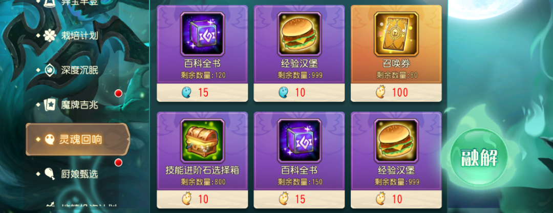 1、通过“融解”功能,可以将已经满星的英雄的溢出灵魂石融解为永不过期的精魄。