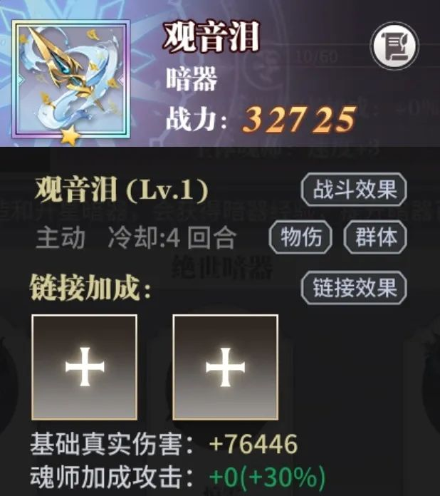 第2回合开始时,对敌方1名/2名/3名/全体魂师造成真实伤害+观音泪攻击力共计4段物理伤害,攻击时有60%的概率为目标附加「无量」;首段伤害优先攻击敌方攻击力最高的魂师,并有100%的概率使其防御在本回合内降低60%;