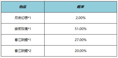 购买礼包必得红蓝对决(1日),可额外随机获得以下之一:月夜幻想x1、亲密玫瑰x1、春江跃鲤x1、春江跃鲤x2。累计20次至少可获得月夜幻想x1。