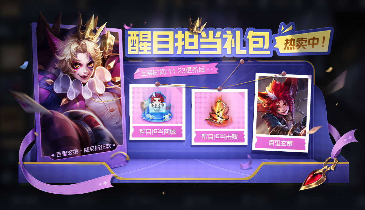 购买礼包必得红蓝对决(1日),可额外随机获得以下之一:百里玄策专属击败和回城特效-醒目担当、百里玄策、威尼斯狂欢、皮肤碎片*2、荣耀积分*20、新品皮肤抽奖券*1。累计150次必得全部局内特效。