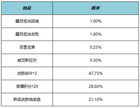 皮肤碎片&积分自选礼盒:打开礼包可任意选择以下奖励之一:荣耀积分*10或皮肤碎片*1