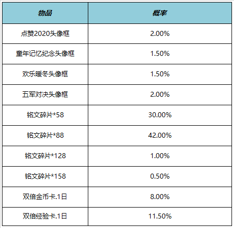 打开后可随机获得以下奖励之一:点赞2020头像框、童年记忆纪念头像框、欢乐暖冬头像框、五军对决头像框、双倍金币卡:1日、双倍经验卡:1日、铭文碎片x158/128/88/58。