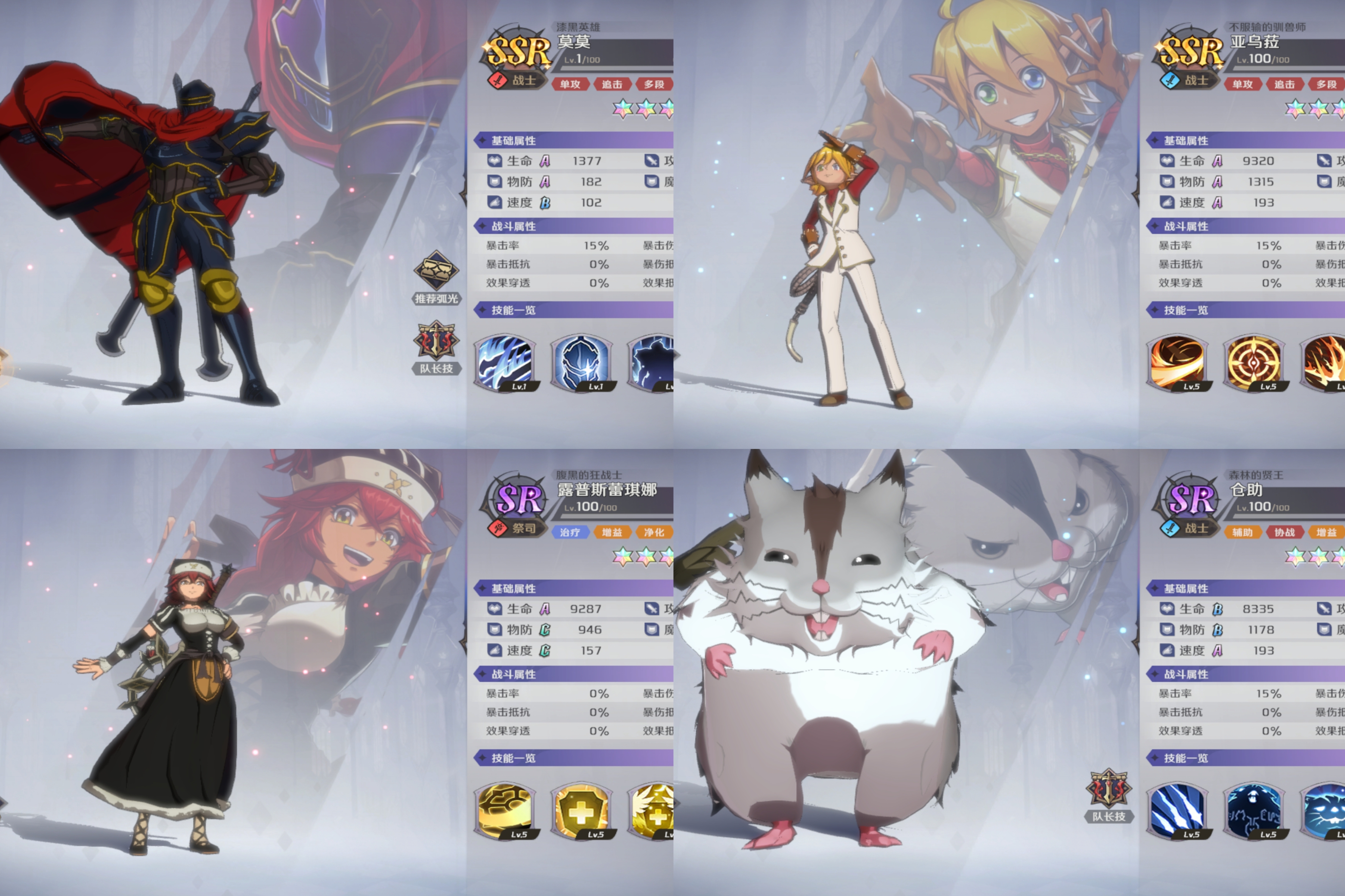 最后就是搭配我们万金油辅助仓助减防御+追击敌人。狼妹治疗全体队友,提高队伍的续航。