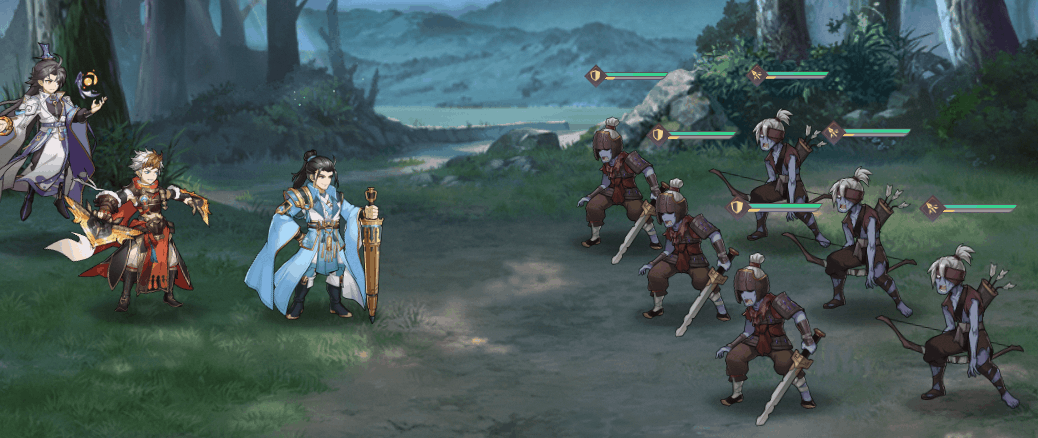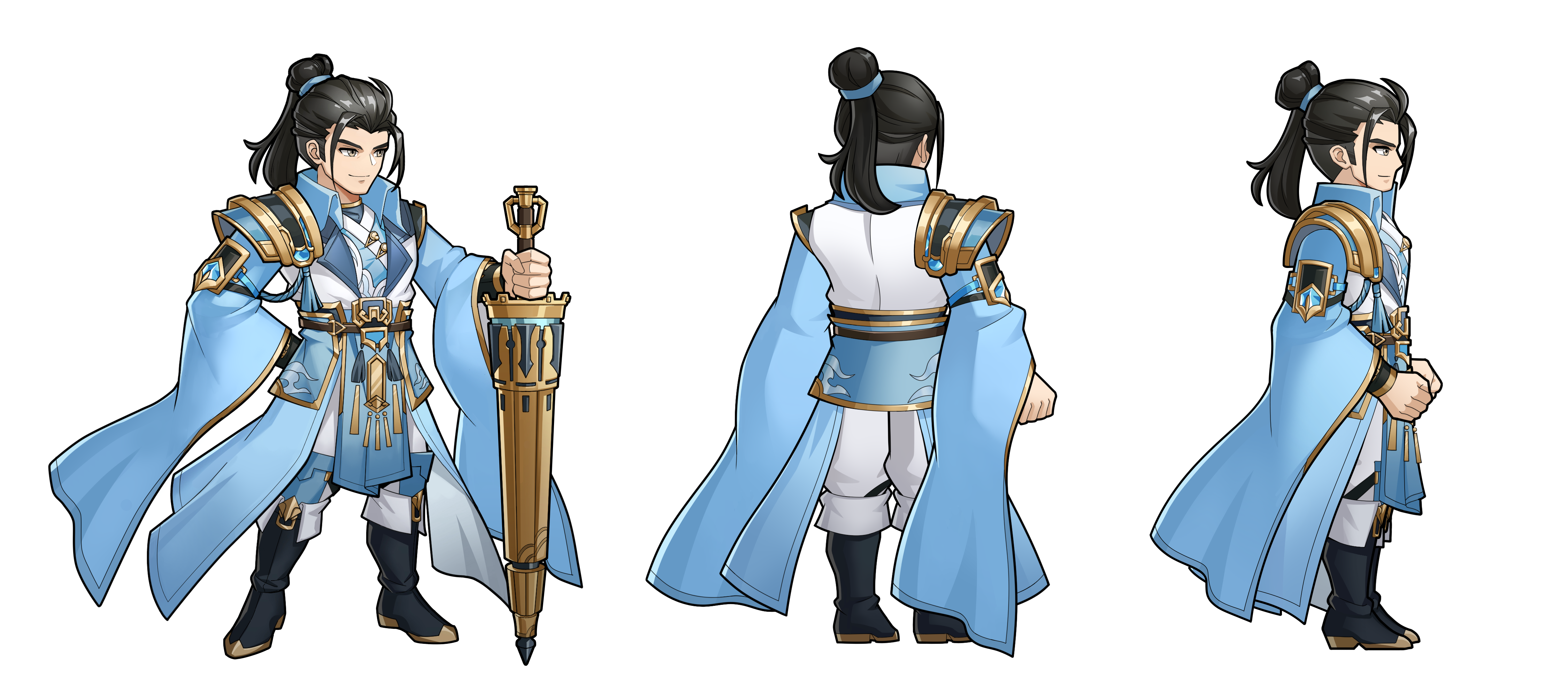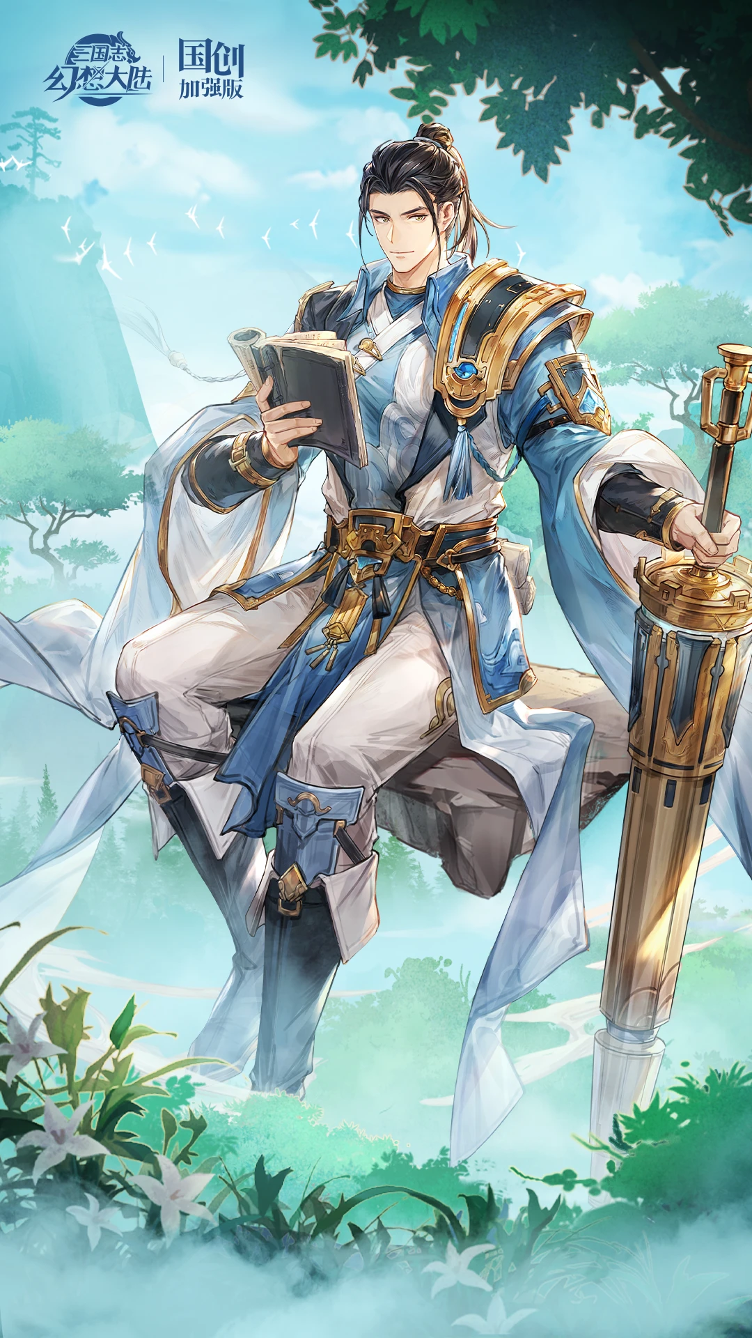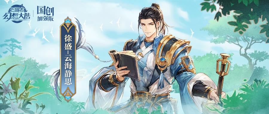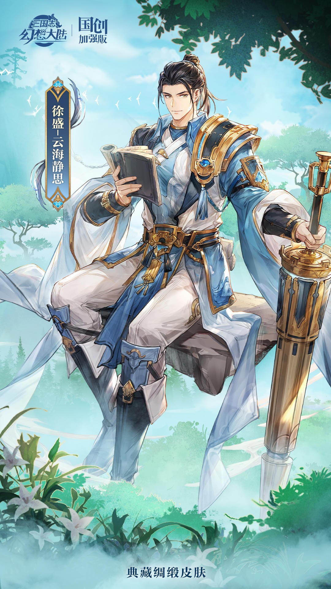 皮肤以清新稳重的蓝白为配色,尽显他儒雅随和,平易近人的性格特质。展现徐盛端坐群山云海之间,手握古书残卷的一瞬。新衣主体为霁色广袖上衣和白色下装,在外层无袖罩袍之下,露出胸前的云纹。单侧肩甲点缀着霁色流苏,腰间垂下同色衣裾因坐姿在岩石上散开,护膝与鞋靴都是柔软的材质,都暗示这是一套日常、轻松的装扮。就连左手松握的铁锏也加入晶莹的蓝色,在阳光下变得柔和起来。