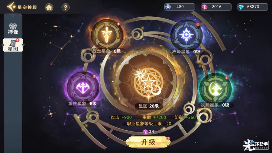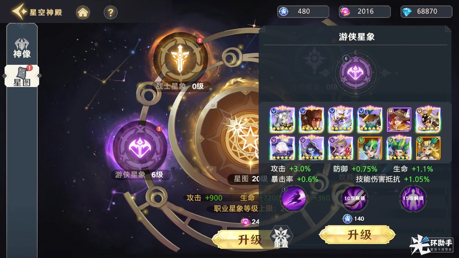玩家首次获得初始稀有英雄,或将初始稀有英雄首次升阶至更高品阶时可获得星辰,星辰可提升星图等级。星图等级可以给全队英雄提供额外的攻击力、生命值和防御力加成。
