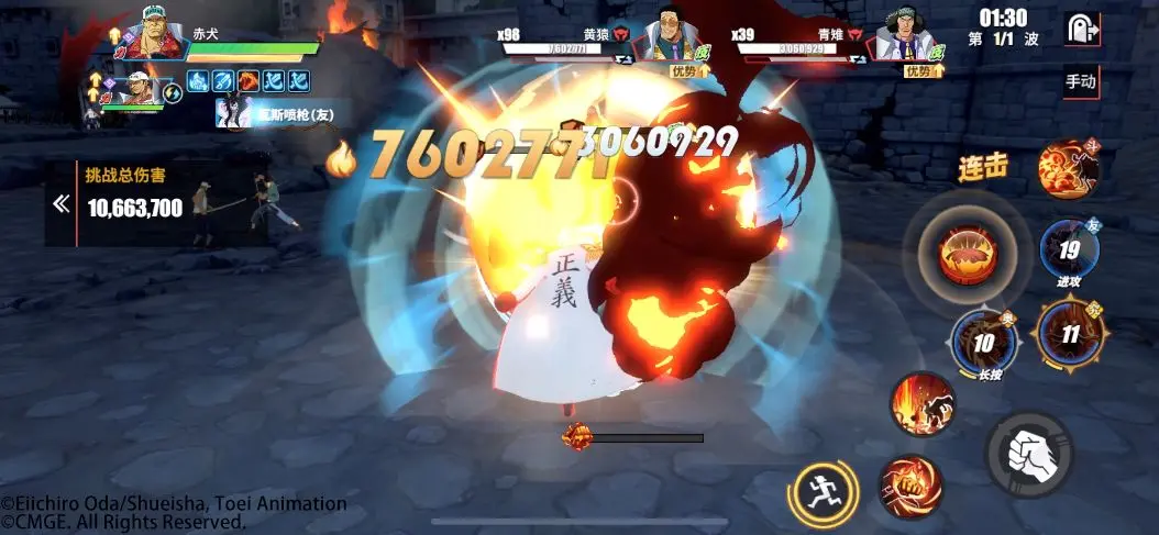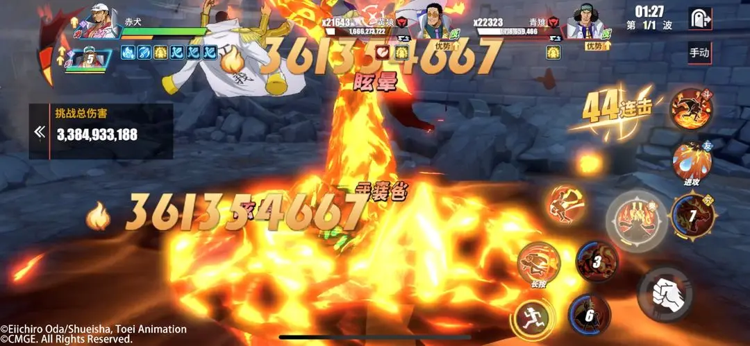海军元帅 赤犬在PVE中的表现优势可以用通用的PVE三大关键词完美概括:输出环境、超强续航、超高爆发。