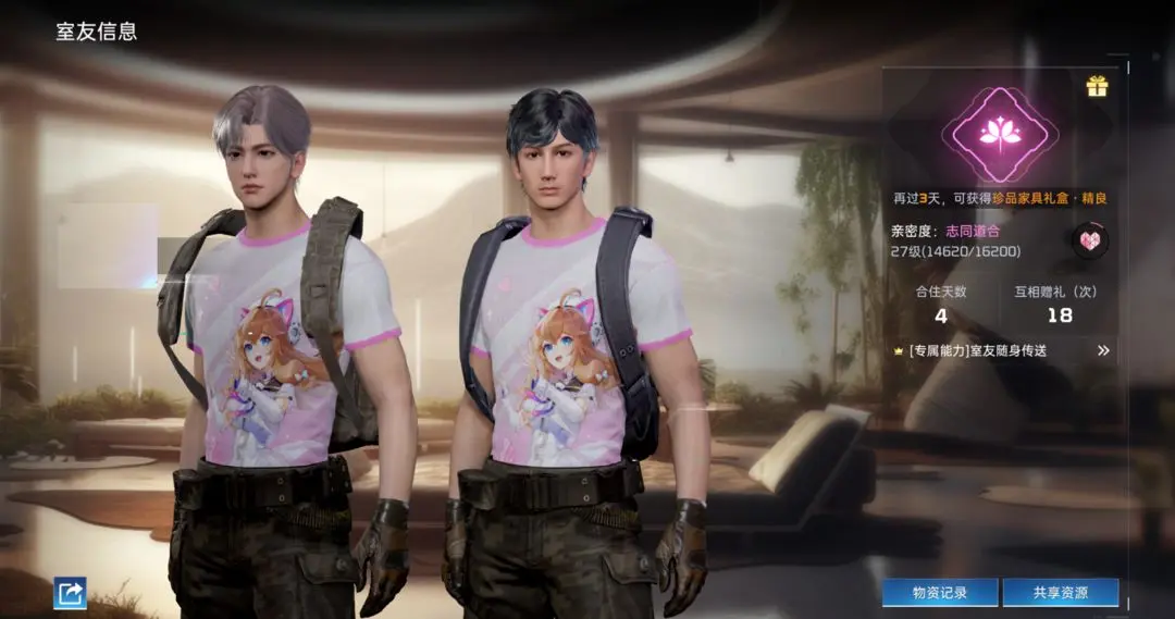 逐渐适应了未来生活,是时候考虑找个志同道合的生存伙伴了。成为室友,共建同一个庄园,资源、电力、庄园等级共享,还可解锁室友随身传送功能!