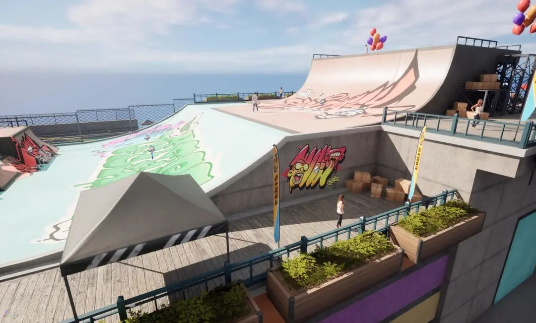 这是热湾中心区的一座屋顶滑板车,在这里你可以俯视到热湾中心区的美丽景色,或者和朋友一起休闲娱乐,放松一下。作为热湾中心区里为数不多的休闲场所,在滑板公园的门口记得要先下车哦~